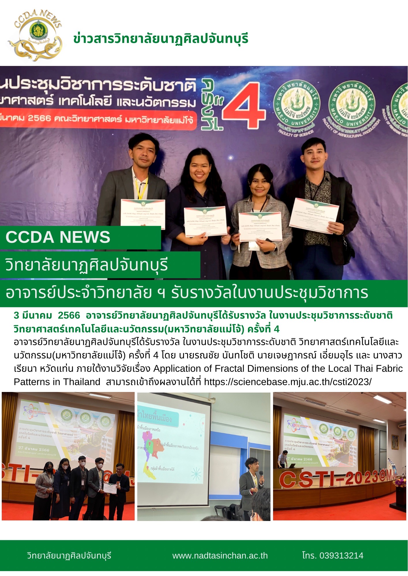 อาจารย์วิทยาลัยนาฏศิลปจันทบุรีได้รับรางวัล ในงานประชุมวิชาการระดับชาติ วิทยาศาสตร์เทคโนโลยีและนวัตกรรม(มหาวิทยาลัยแม่โจ้) ครั้งที่ 4 โดย นายรณชัย นันทโชติ นายเจษฏากรณ์ เอี่ยมอุไร และ นางสาวเรียนา หวัดแท่น ภายใต้งานวิจัยเรื่อง Application of Fractal Dimensions of the Local Thai Fabric Patterns in Thailand ขณะนี้ผลงานได้ถูกเผยแพร่แล้ว สามารถเข้าถึงผลงานได้ที่
