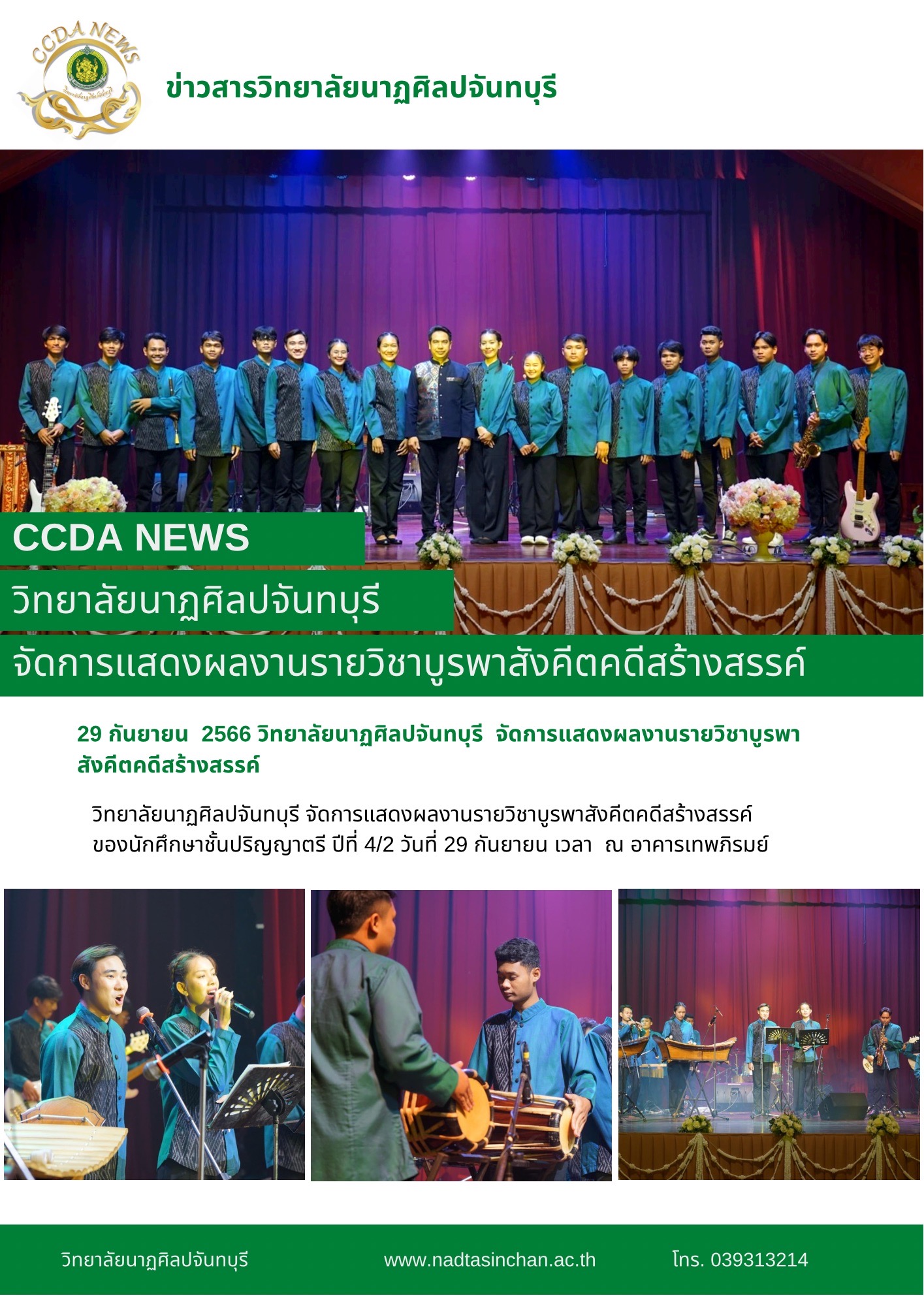 วิทยาลัยนาฏศิลปจันทบุรี จัดการแสดงผลงานรายวิชาบูรพาสังคีตคดีสร้างสรรค์ ของนักศึกษาชั้นปริญญาตรี ปีที่ 4/2 วันที่ 29 กันยายน เวลา  ณ อาคารเทพภิรมย์ วิทยาลัยนาฏศิลปจันทบุรี