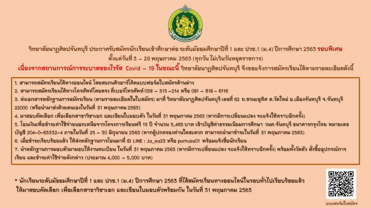 วิทยาลัยนาฏศิลปจันทบุรี ประกาศรับสมัครนักเรียนเข้าศึกษาต่อ ระดับมัธยมศึกษาปีที่ 1 และ ปวช.1 (ม.4) ปีการศึกษา 2563 รอบพิเศษ ตั้งแต่วันที่ 3 – 29 พฤษภาคม 2563 (ทุกวัน ไม่เว้นวันหยุดราชการ) เนื่องจากสถานการณ์การระบาดของไวรัส Covid – 19 ในขณะนี้ วิทยาลัยนาฏศิลปจันทบุรี จึงขอแจ้งการสมัครเรียนได้ตามรายละเอียดดังนี้