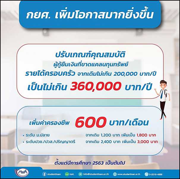 กองทุนเงินให้กู้ยืมเพื่อการศึกษา (กยศ.) ยืนยันว่าในปีการศึกษา 2563 มีวงเงินให้กู้ยืมเพียงพอแก่นักเรียน นักศึกษาทุกคนอย่างแน่นอน พร้อมเพิ่มเกณฑ์รายได้ครอบครัวของผู้กู้ยืมที่ขาดแคลนทุนทรัพย์จากเดิมไม่เกิน 200,000 บาท/ปี เป็นไม่เกิน 360,000 บาท/ปี และเพิ่มค่าครองชีพให้อีกรายละ 600 บาท/เดือน ทุกระดับการศึกษา อีกทั้ง ส่งเสริมให้ศึกษาในสาขาวิชาที่เป็นความต้องการหลักซึ่งมีความจำเป็นต่อการพัฒนาประเทศ