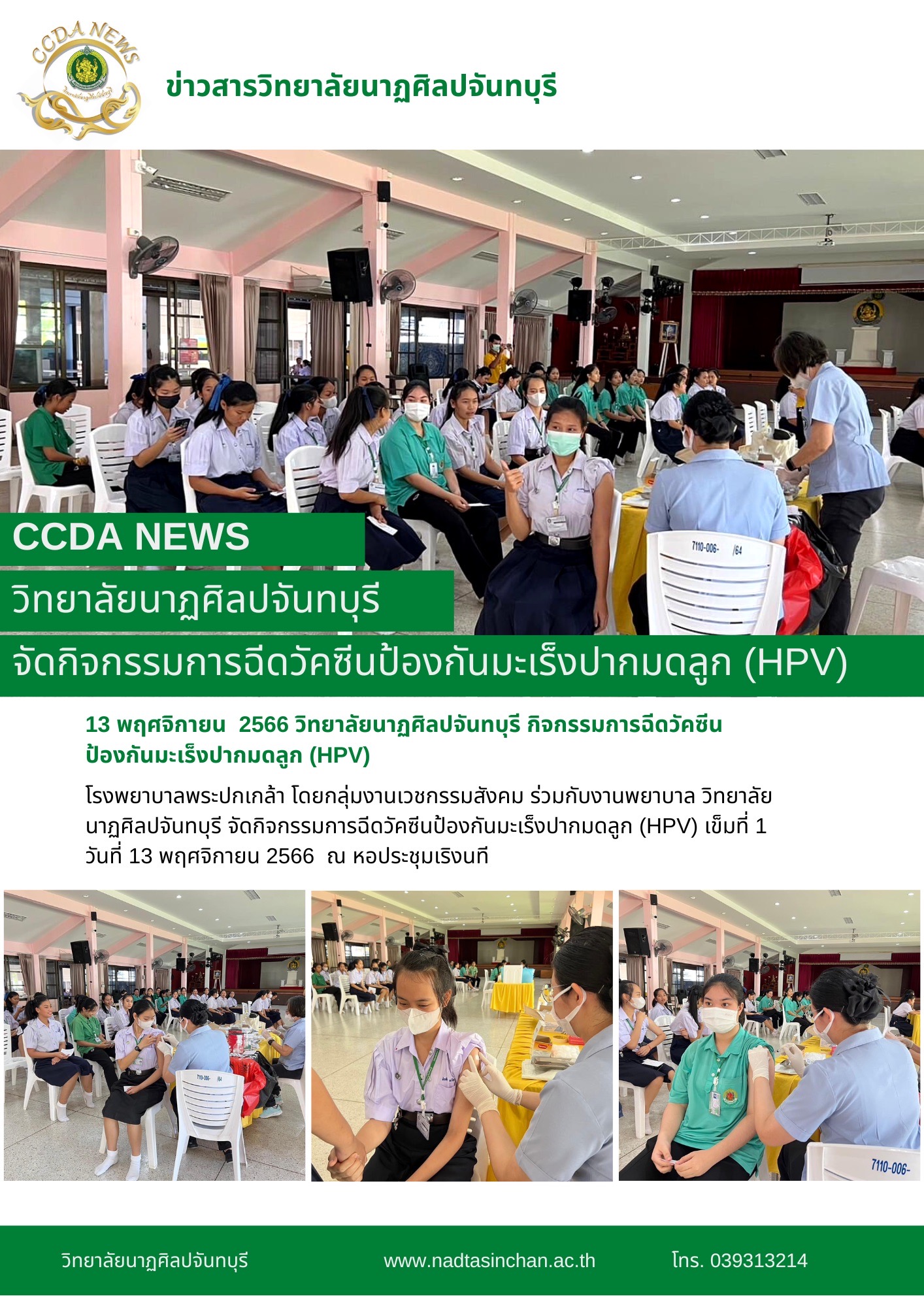 โรงพยาบาลพระปกเกล้า โดยกลุ่มงานเวชกรรมสังคม ร่วมกับงานพยาบาล วิทยาลัยนาฏศิลปจันทบุรี จัดกิจกรรมการฉีดวัคซีนป้องกันมะเร็งปากมดลูก (HPV) เข็มที่ 1 วันที่ 13 พฤศจิกายน 2566 ณ หอประชุมเริงนที