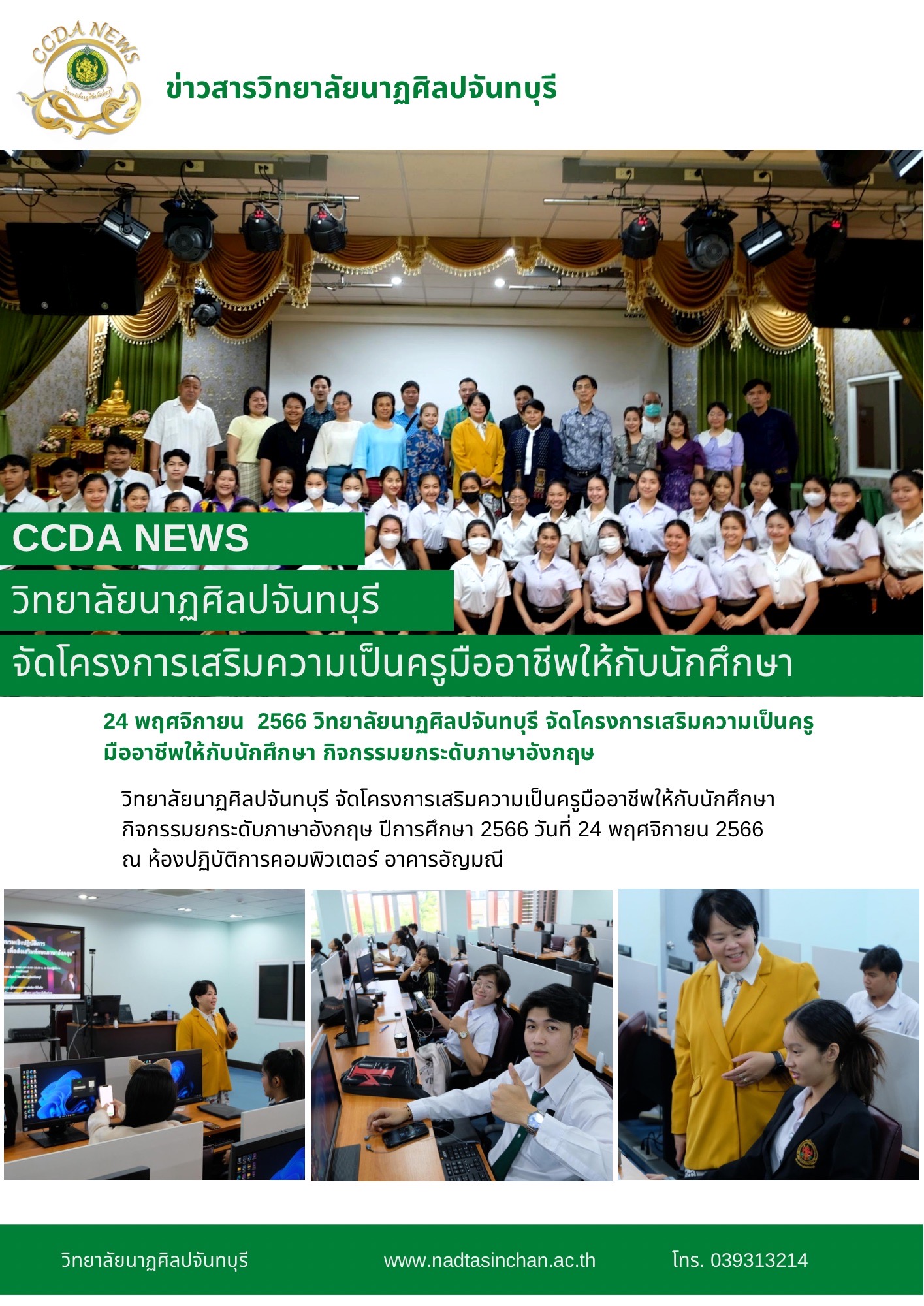 วิทยาลัยนาฏศิลปจันทบุรี จัดโครงการเสริมความเป็นครูมืออาชีพให้กับนักศึกษา กิจกรรมยกระดับภาษาอังกฤษ ปีการศึกษา 2566 วันที่ 24 พฤศจิกายน 2566 ณ ห้องปฏิบัติการคอมพิวเตอร์ อาคารอัญมณี