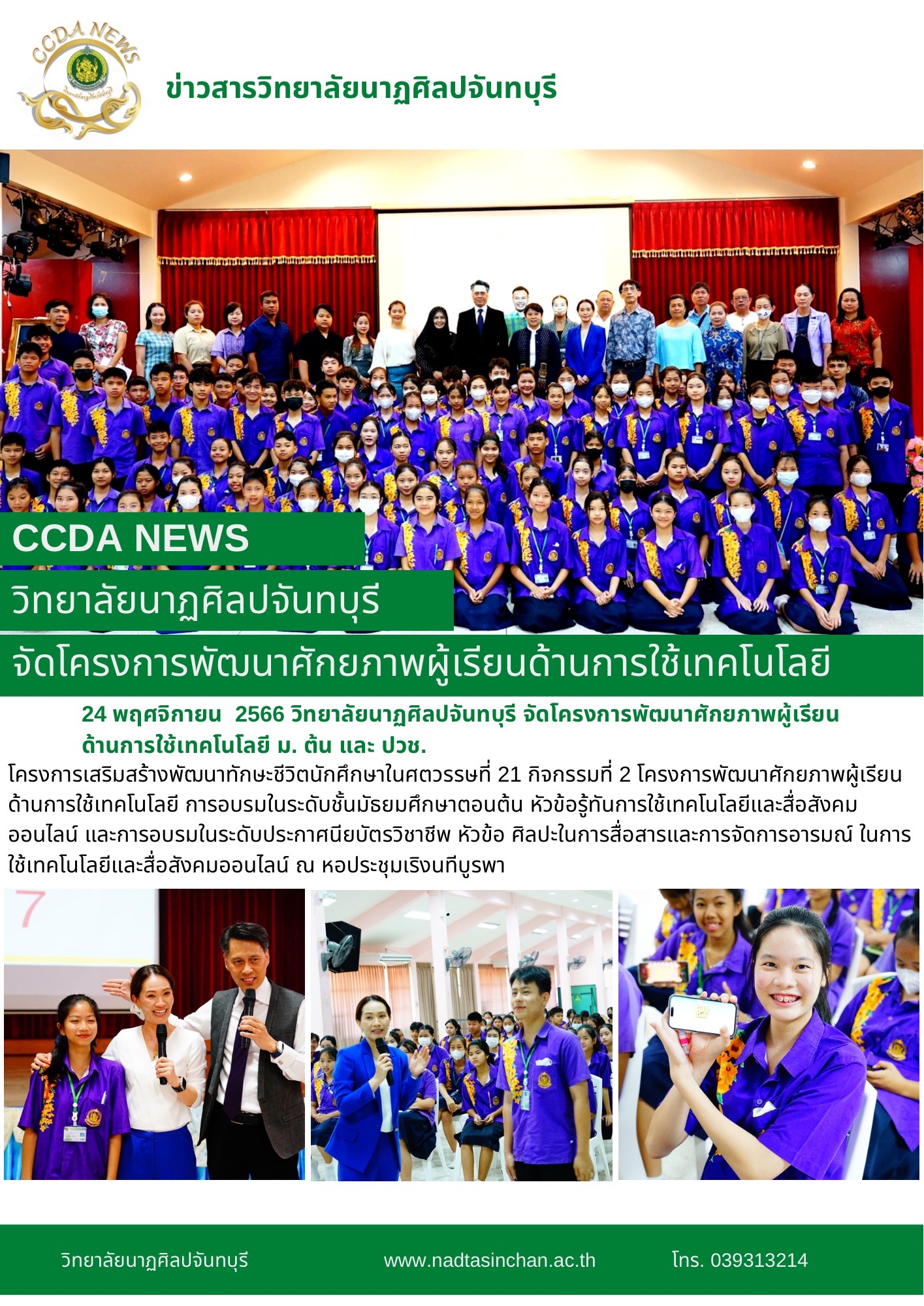 วิทยาลัยนาฏศิลปจันทบุรี จัดโครงการเสริมสร้างพัฒนาทักษะชีวิตนักศึกษาในศตวรรษที่ 21 กิจกรรมที่ 2 โครงการพัฒนาศักยภาพผู้เรียนด้านการใช้เทคโนโลยี การอบรมในระดับชั้นมัธยมศึกษาตอนต้น หัวข้อรู้ทันการใช้เทคโนโลยีและสื่อสังคมออนไลน์ และการอบรมในระดับประกาศนียบัตรวิชาชีพ หัวข้อ ศิลปะในการสื่อสารและการจัดการอารมณ์ ในการใช้เทคโนโลยีและสื่อสังคมออนไลน์ วันที่ 24 พฤศจิกายน 2566 ณ หอประชุมเริงนทีบูรพา