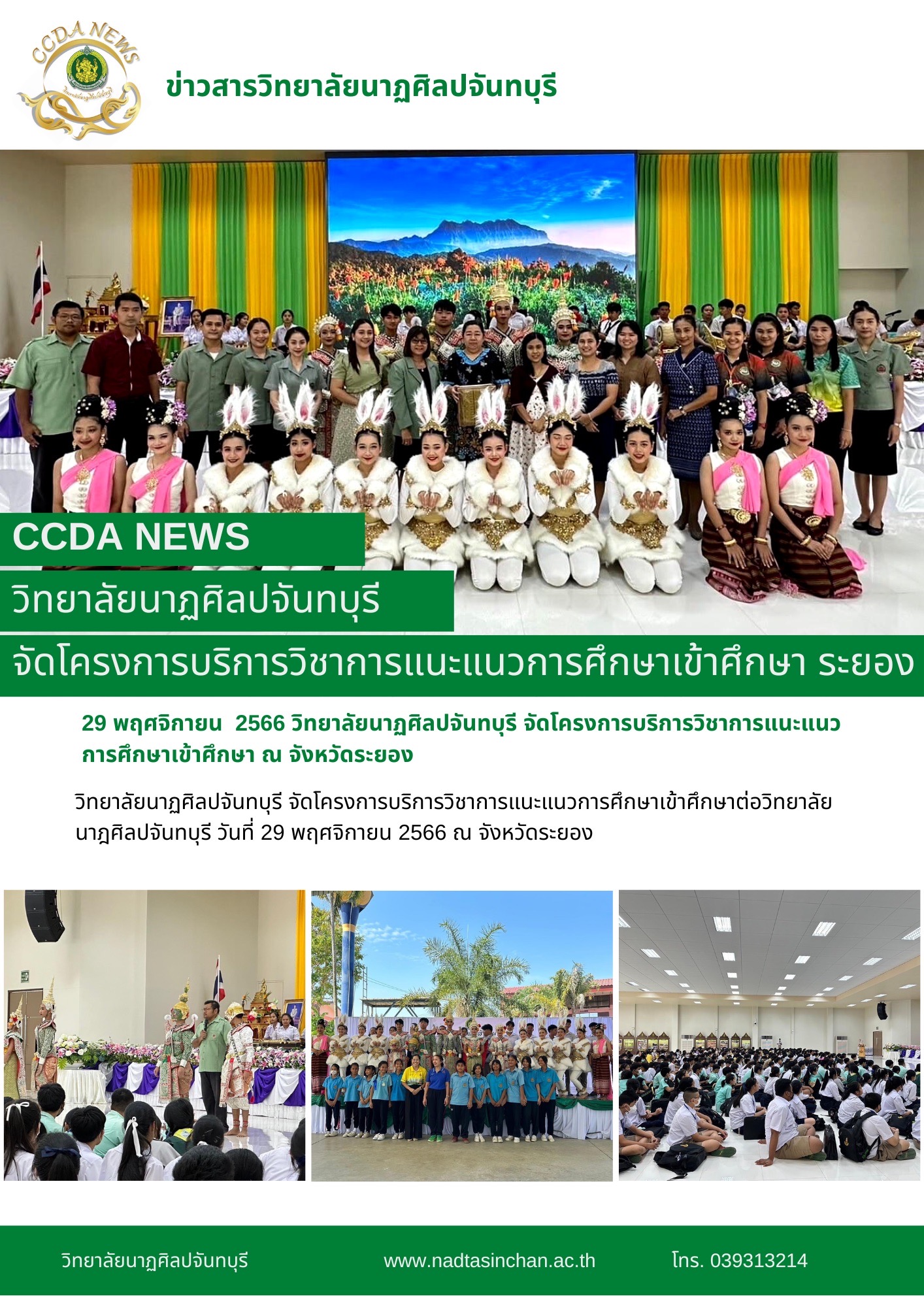 วิทยาลัยนาฏศิลปจันทบุรี จัดโครงการบริการวิชาการแนะแนวการศึกษาเข้าศึกษาต่อวิทยาลัยนาฎศิลปจันทบุรี วันที่ 29 พฤศจิกายน 2566 ณ จังหวัดระยอง