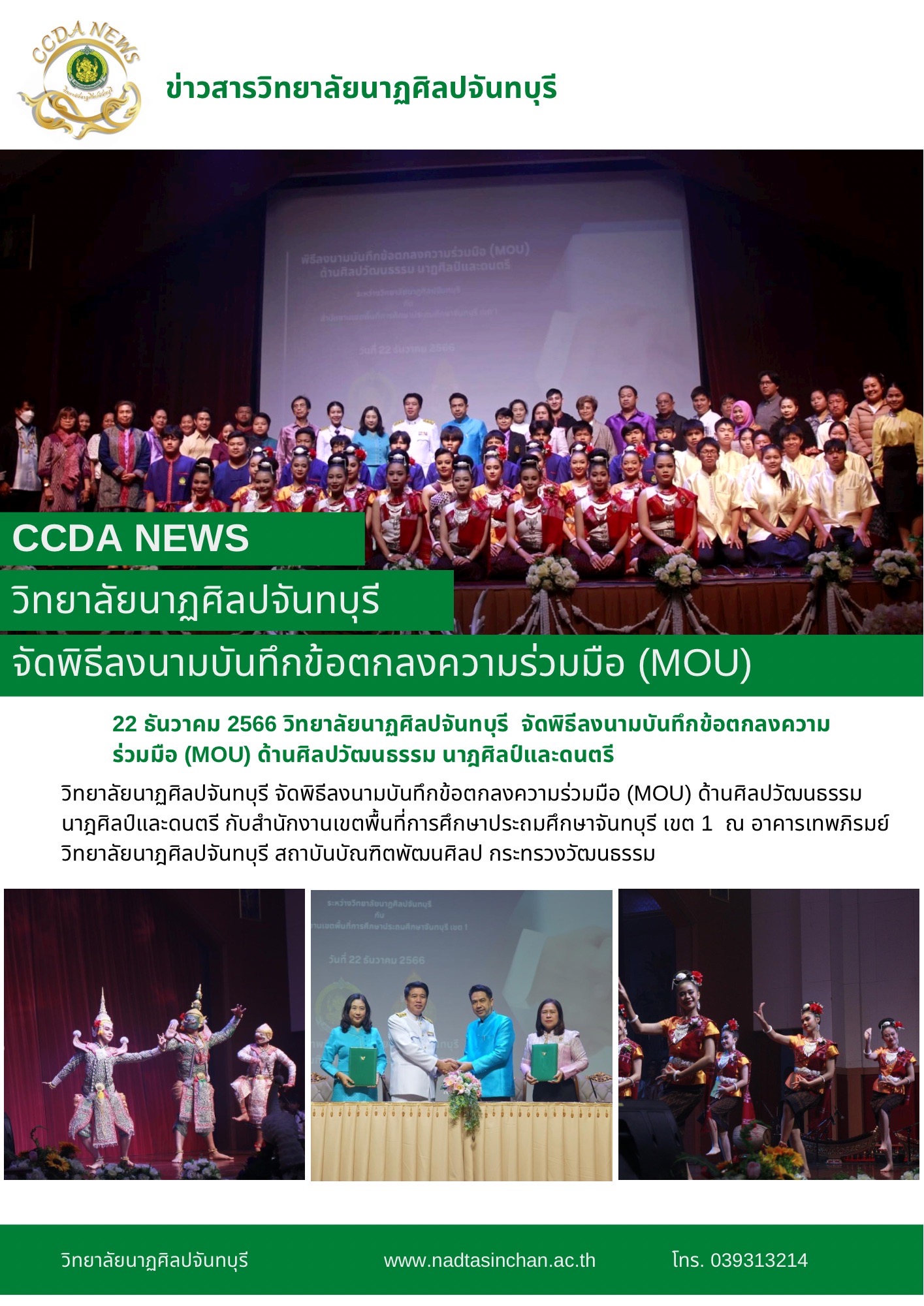 วิทยาลัยนาฏศิลปจันทบุรี จัดพิธีลงนามบันทึกข้อตกลงความร่วมมือ (MOU) ด้านศิลปวัฒนธรรม นาฎศิลป์และดนตรี กับสำนักงานเขตพื้นที่การศึกษาประถมศึกษาจันทบุรี เขต 1 วันที่ 22 ธันวาคม 2566 ณ อาคารเทพภิรมย์ วิทยาลัยนาฎศิลปจันทบุรี สถาบันบัณฑิตพัฒนศิลป กระทรวงวัฒนธรรม