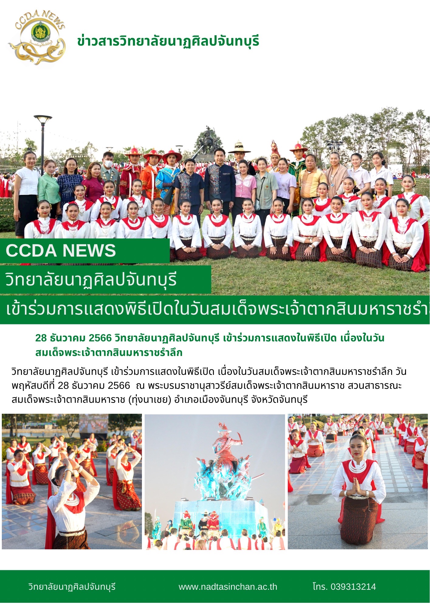 วิทยาลัยนาฏศิลปจันทบุรี เข้าร่วมการแสดงในพิธีเปิด เนื่องในวันสมเด็จพระเจ้าตากสินมหาราชรำลึก วันพฤหัสบดีที่ 28 ธันวาคม 2566 ณ พระบรมราชานุสาวรีย์สมเด็จพระเจ้าตากสินมหาราช สวนสาธารณะสมเด็จพระเจ้าตากสิน