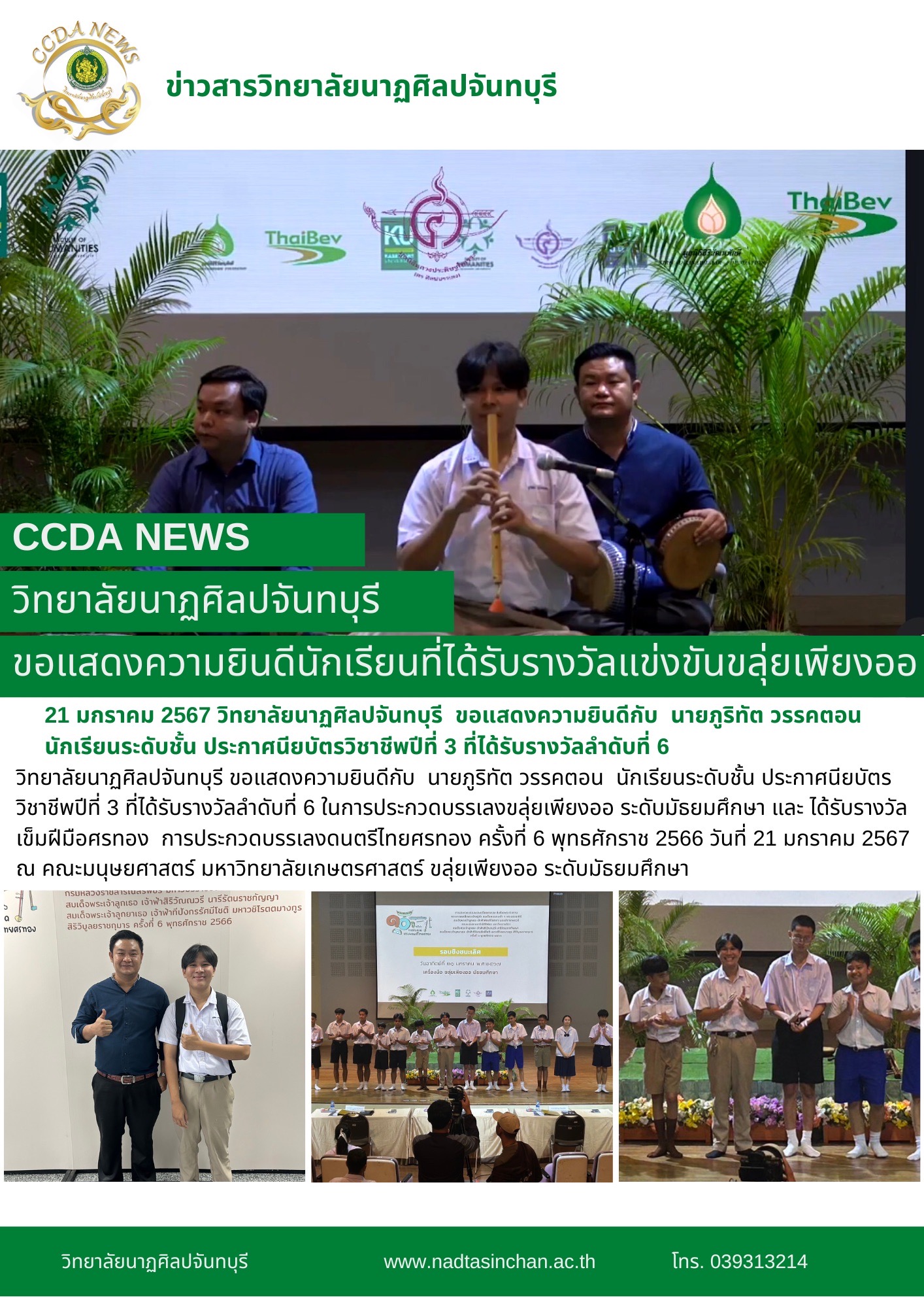 วิทยาลัยนาฏศิลปจันทบุรี ขอแสดงความยินดีกับ นายภูริทัต วรรคตอน นักเรียนระดับชั้น ประกาศนียบัตรวิชาชีพปีที่ 3 ที่ได้รับรางวัลลำดับที่ 6 ในการประกวดบรรเลงขลุ่ยเพียงออ ระดับมัธยมศึกษา และ ได้รับรางวัลเข็มฝีมือศรทอง การประกวดบรรเลงดนตรีไทยศรทอง ครั้งที่ 6 พุทธศักราช 2566 วันที่ 21 มกราคม 2567 ณ คณะมนุษยศาสตร์ มหาวิทยาลัยเกษตรศาสตร์ ขลุ่ยเพียงออ ระดับมัธยมศึกษา