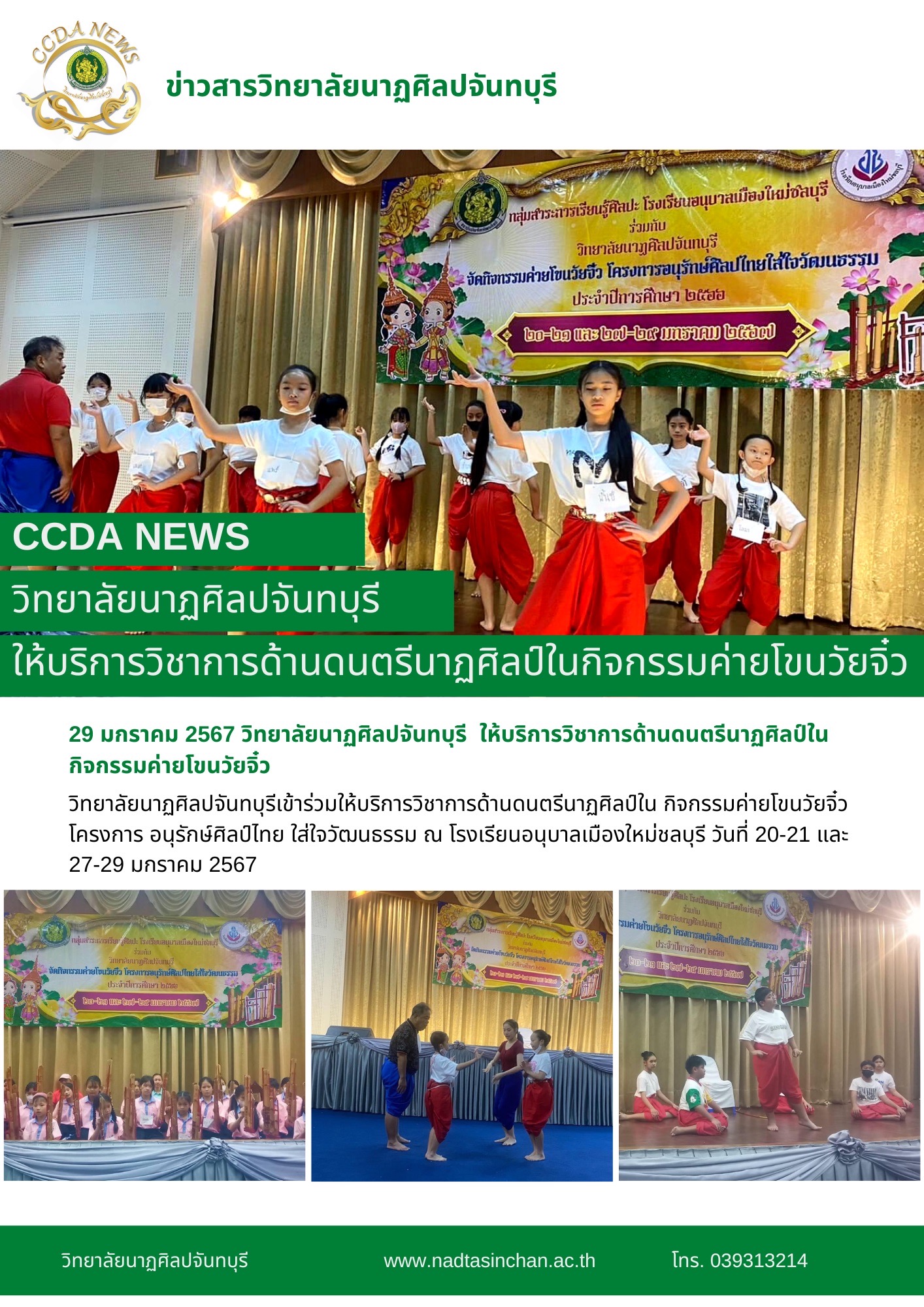 วิทยาลัยนาฏศิลปจันทบุรีเข้าร่วมให้บริการวิชาการด้านดนตรีนาฏศิลป์ใน กิจกรรมค่ายโขนวัยจิ๋ว โครงการ อนุรักษ์ศิลป์ไทย ใส่ใจวัฒนธรรม ณ โรงเรียนอนุบาลเมืองใหม่ชลบุรี วันที่ 20-21 และ 27-29 มกราคม 2567