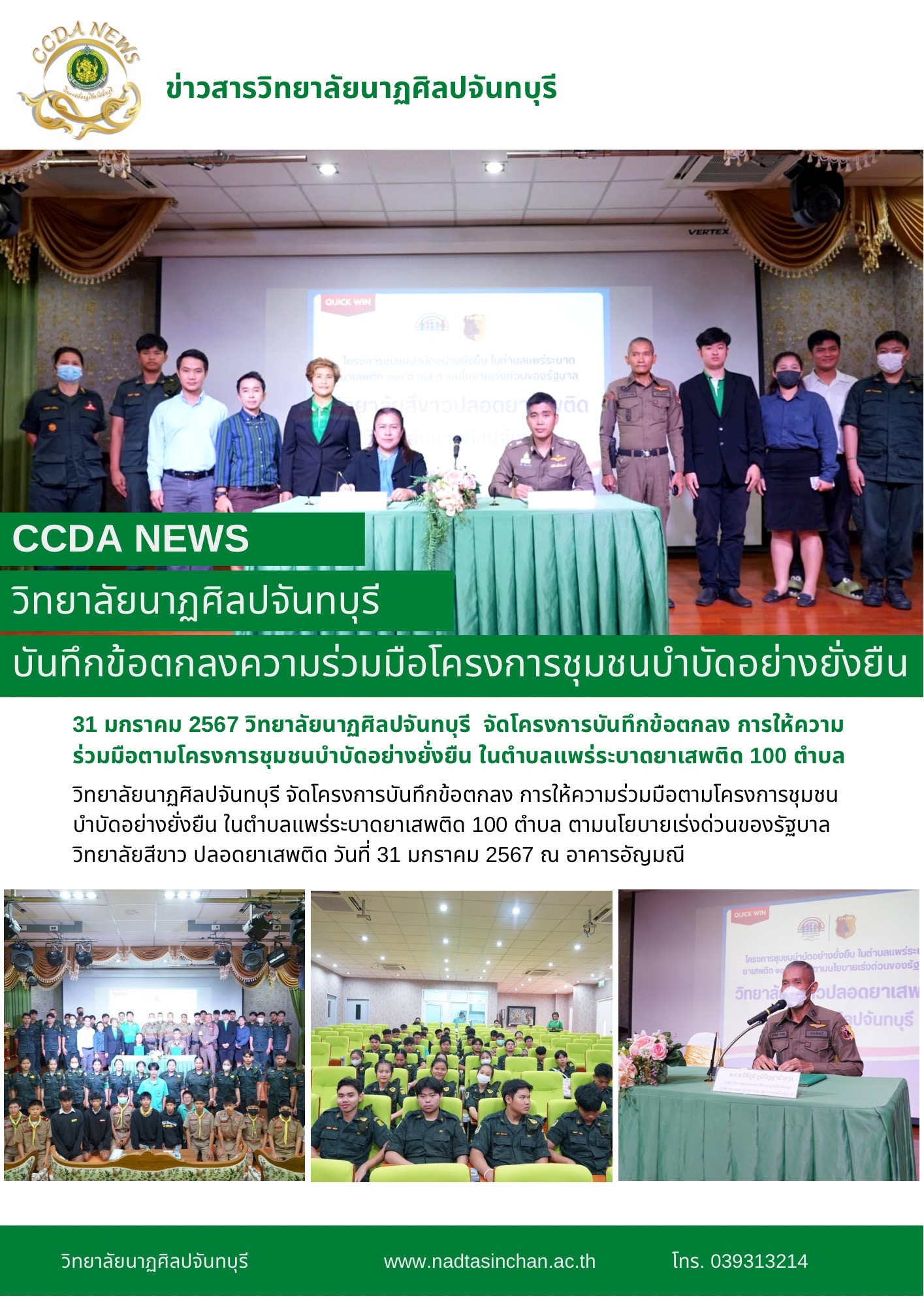 วิทยาลัยนาฏศิลปจันทบุรี จัดโครงการบันทึกข้อตกลง การให้ความร่วมมือตามโครงการชุมชนบำบัดอย่างยั่งยืน ในตำบลแพร่ระบาดยาเสพติด 100 ตำบล ตามนโยบายเร่งด่วนของรัฐบาล วิทยาลัยสีขาว ปลอดยาเสพติด วันที่ 31 มกราคม 2567 ณ อาคารอัญมณี