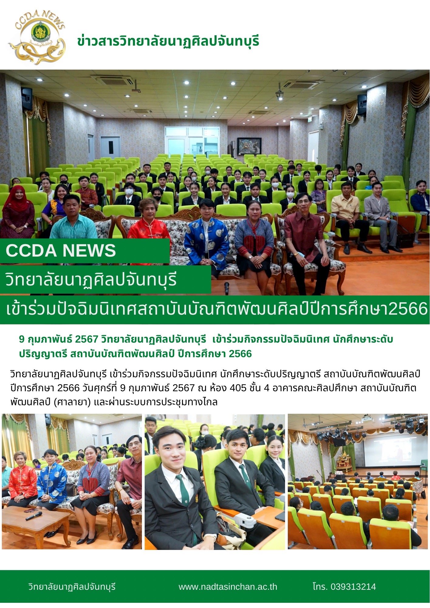 วิทยาลัยนาฏศิลปจันทบุรี เข้าร่วมกิจกรรมปัจฉิมนิเทศ นักศึกษาระดับปริญญาตรี สถาบันบัณฑิตพัฒนศิลป์ ปีการศึกษา 2566 วันศุกร์ที่ 9 กุมภาพันธ์ 2567 ณ ห้อง 405 ชั้น 4 อาคารคณะศิลปศึกษา สถาบันบัณฑิตพัฒนศิลป์ (ศาลายา) และผ่านระบบการประชุมทางไกล