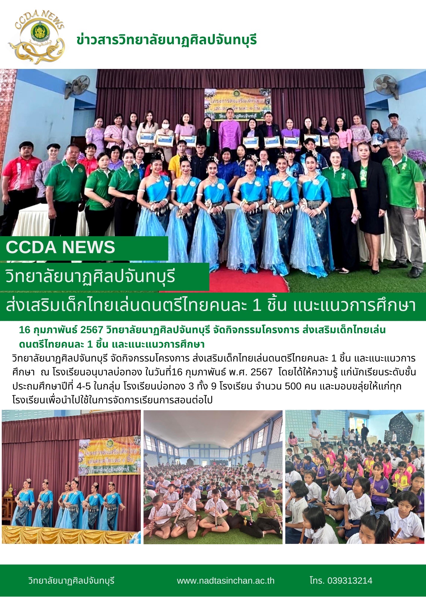 วิทยาลัยนาฏศิลปจันทบุรี จัดกิจกรรมโครงการ ส่งเสริมเด็กไทยเล่นดนตรีไทยคนละ 1 ชิ้น และแนะแนวการศึกษา ณ โรงเรียนอนุบาลบ่อทอง ในวันที่16 กุมภาพันธ์ พ.ศ. 2567 โดยได้ให้ความรู้ แก่นักเรียนระดับชั้นประถมศึกษาปีที่ 4-5 ในกลุ่ม โรงเรียนบ่อทอง 3 ทั้ง 9 โรงเรียน จำนวน 500 คน และมอบขลุ่ยให้แก่ทุกโรงเรียนเพื่อนำไปใช้ในการจัดการเรียนการสอนต่อไป
