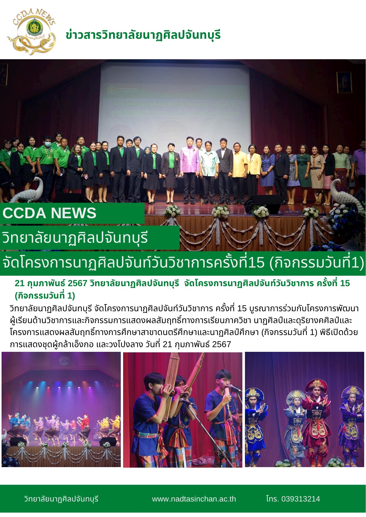 วิทยาลัยนาฏศิลปจันทบุรี จัดโครงการนาฏศิลปจันท์วันวิชาการ ครั้งที่ 15 บูรณาการร่วมกับโครงการพัฒนาผู้เรียนด้านวิชาการและกิจกรรมการแสดงผลสัมฤทธิ์ทางการเรียนภาควิชา นาฏศิลป์และดุริยางคศิลป์และโครงการแสดงผลสัมฤทธิ์ทางการศึกษาสาขาดนตรีศึกษาและนาฏศิลป์ศึกษา (กิจกรรมวันที่ 1) พิธีเปิดด้วยการแสดงชุดผู้กล้าเอ็งกอ และวงโปงลาง ระหว่างวันที่ 21 กุมภาพันธ์ 2567