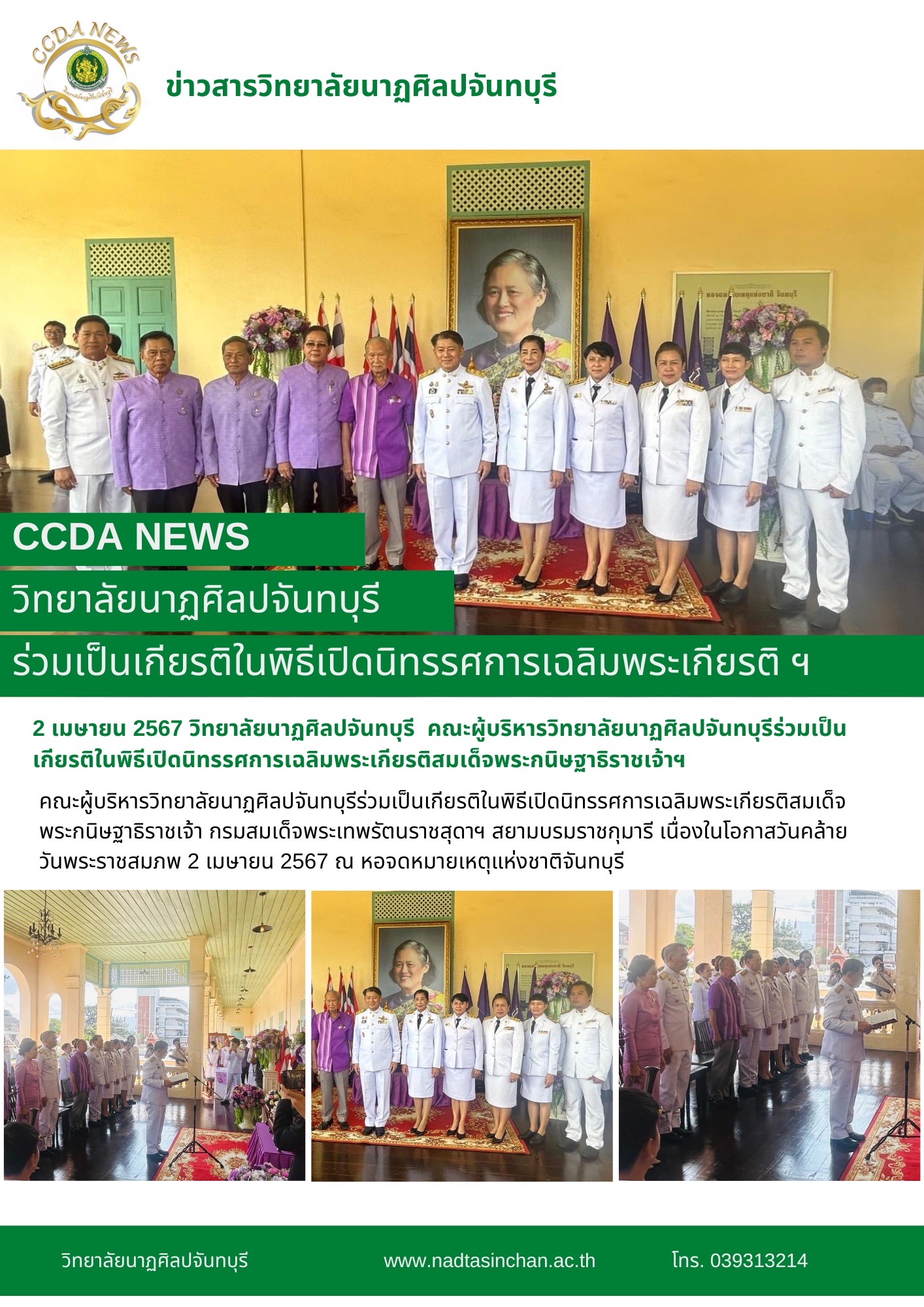 คณะผู้บริหารวิทยาลัยนาฏศิลปจันทบุรีร่วมเป็นเกียรติในพิธีเปิดนิทรรศการเฉลิมพระเกียรติสมเด็จพระกนิษฐาธิราชเจ้า กรมสมเด็จพระเทพรัตนราชสุดาฯ สยามบรมราชกุมารี เนื่องในโอกาสวันคล้ายวันพระราชสมภพ 2 เมษายน 25