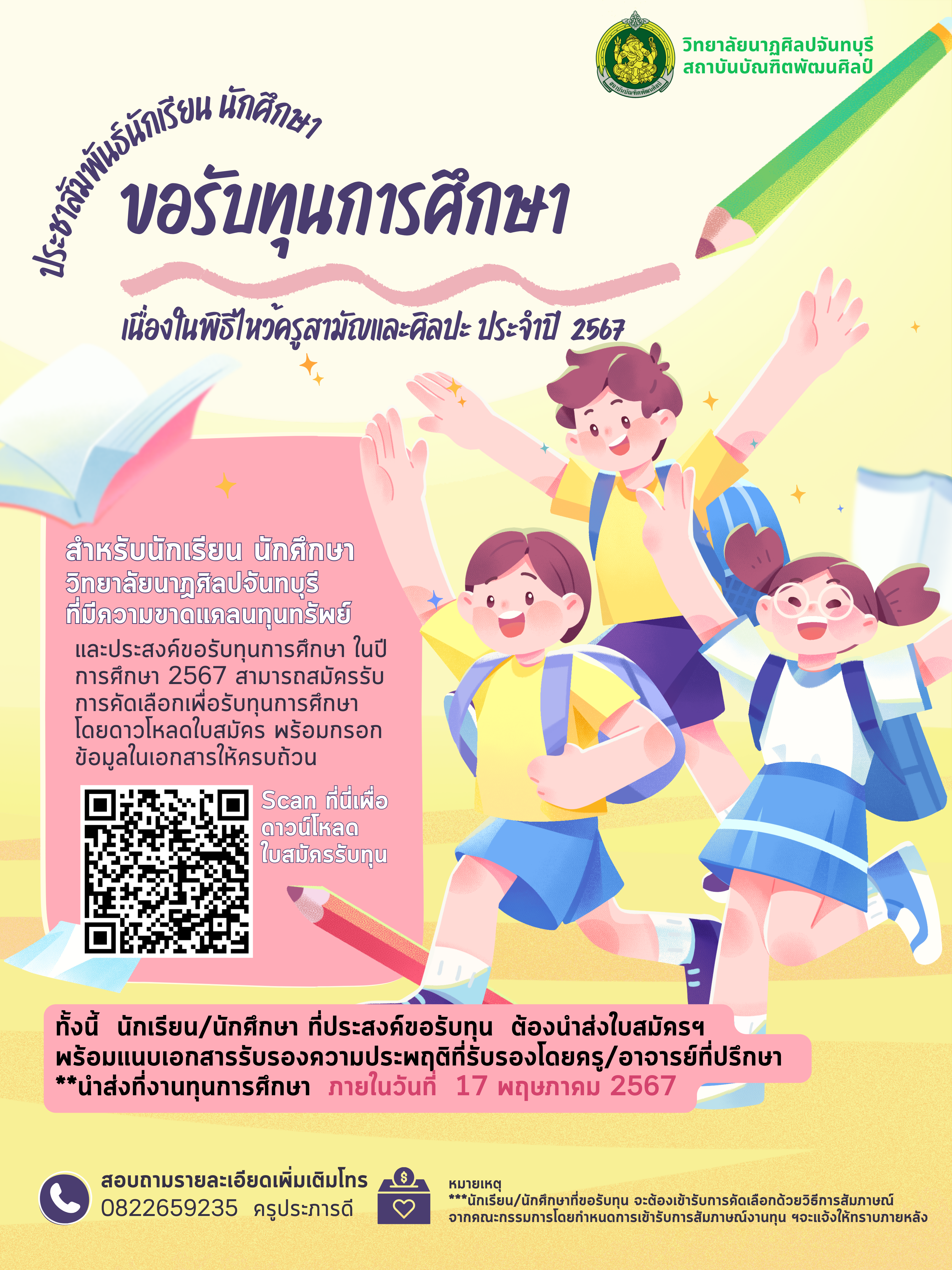 ?งานทุนการศึกษา วิทยาลัยนาฏศิลปจันทบุรี ขอความอนุเคราะห์ และขอเชิญชวนผู้มีอุปะการคุณ และมีจิตศรัทธาทุกท่าน ร่วมกันมอบโอกาสทางการศึกษา และสนับสนุนทุนการศึกษา ให้กับนักเรียน นักศึกษา ที่ขาดแคล