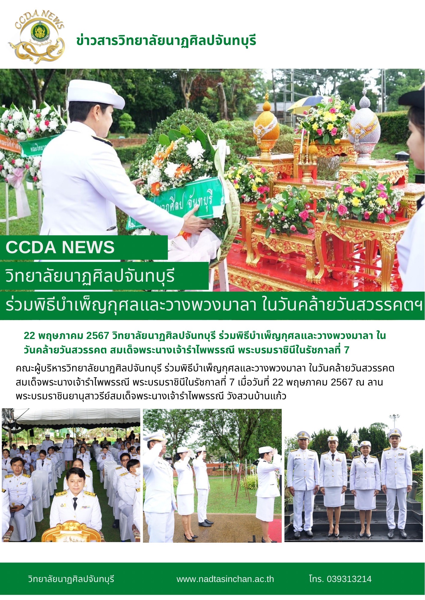 คณะผู้บริหารวิทยาลัยนาฏศิลปจันทบุรี ร่วมพิธีบำเพ็ญกุศลและวางพวงมาลา ในวันคล้ายวันสวรรคต สมเด็จพระนางเจ้ารำไพพรรณี พระบรมราชินีในรัชกาลที่ 7 เมื่อวันที่ 22 พฤษภาคม 2567 ณ ลานพระบรมราชินยานุสาวรีย์สมเด็