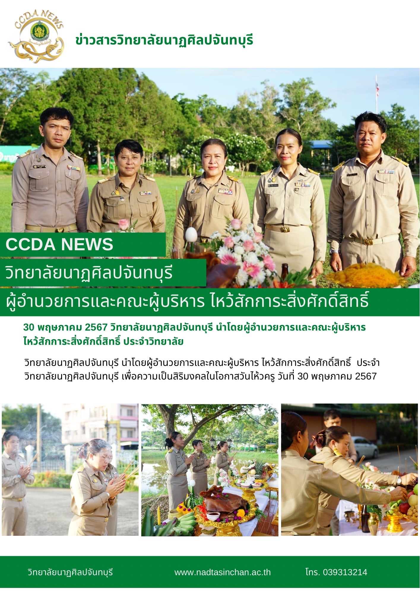 วิทยาลัยนาฏศิลปจันทบุรี นำโดยผู้อำนวยการและคณะผู้บริหาร ไหว้สักการะสิ่งศักดิ์สิทธิ์ ประจำวิทยาลัยนาฏศิลปจันทบุรี เพื่อความเป็นสิริมงคลในโอกาสวันไห้วครู วันที่ 30 พฤษภาคม 2567