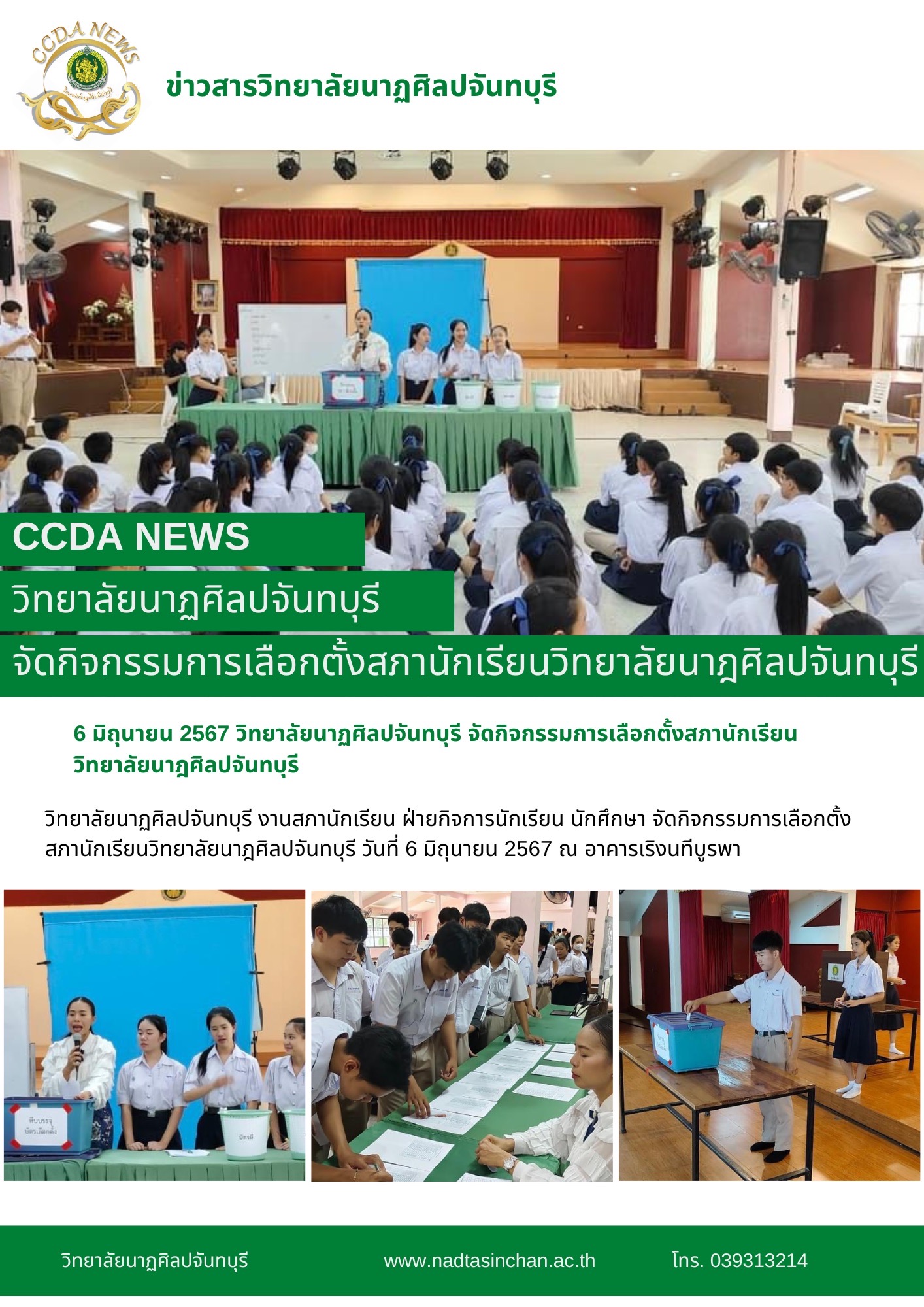 วิทยาลัยนาฏศิลปจันทบุรี งานสภานักเรียน ฝ่ายกิจการนักเรียน นักศึกษา จัดกิจกรรมการเลือกตั้งสภานักเรียนวิทยาลัยนาฎศิลปจันทบุรี วันที่ 6 มิถุนายน 2567 ณ อาคารเริงนทีบูรพา
