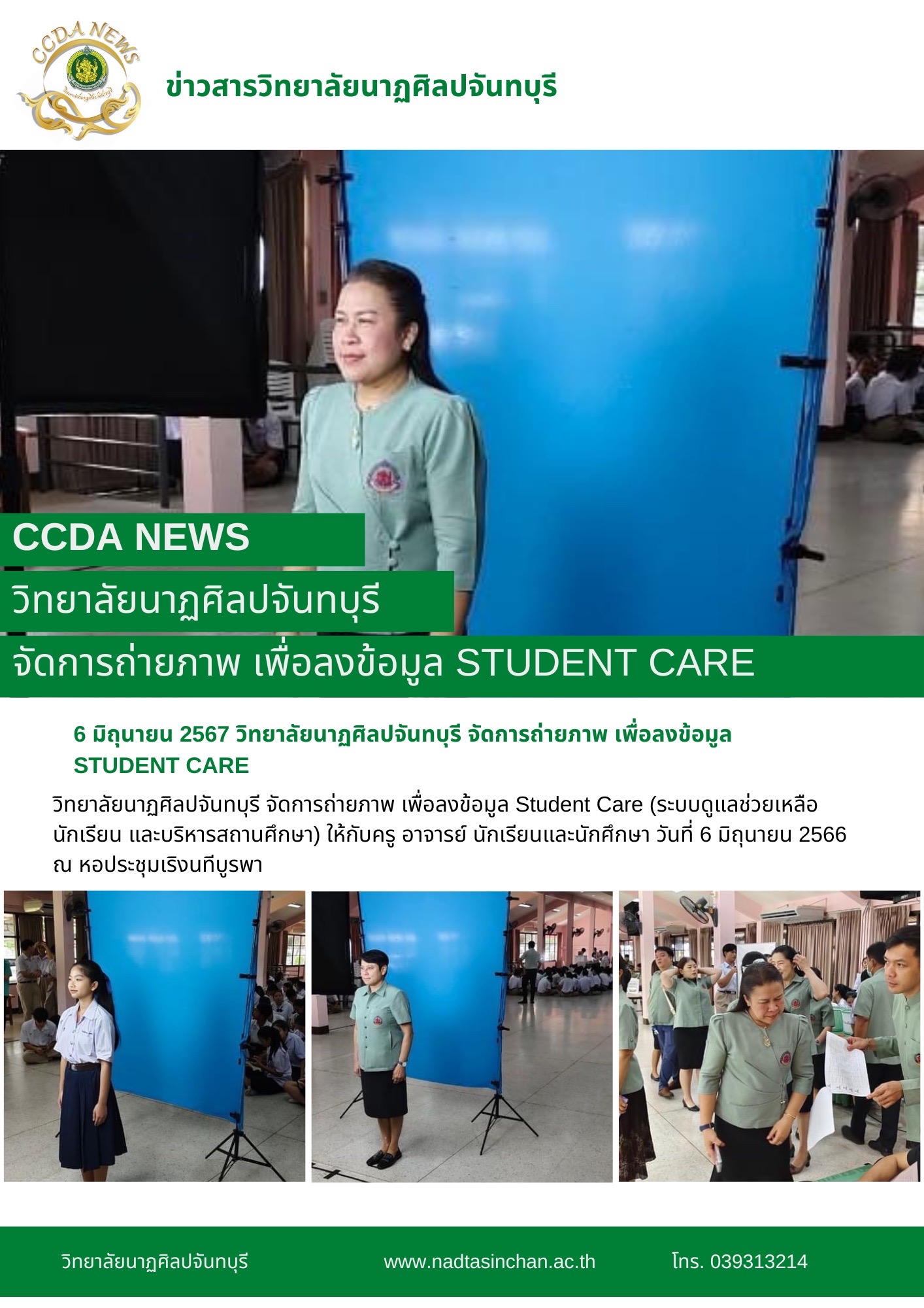 วิทยาลัยนาฏศิลปจันทบุรี จัดการถ่ายภาพ เพื่อลงข้อมูล Student Care (ระบบดูแลช่วยเหลือนักเรียน และบริหารสถานศึกษา) ให้กับครู อาจารย์ นักเรียนและนักศึกษา วันที่ 6 มิถุนายน 2566 ณ หอประชุมเริงนทีบูรพา