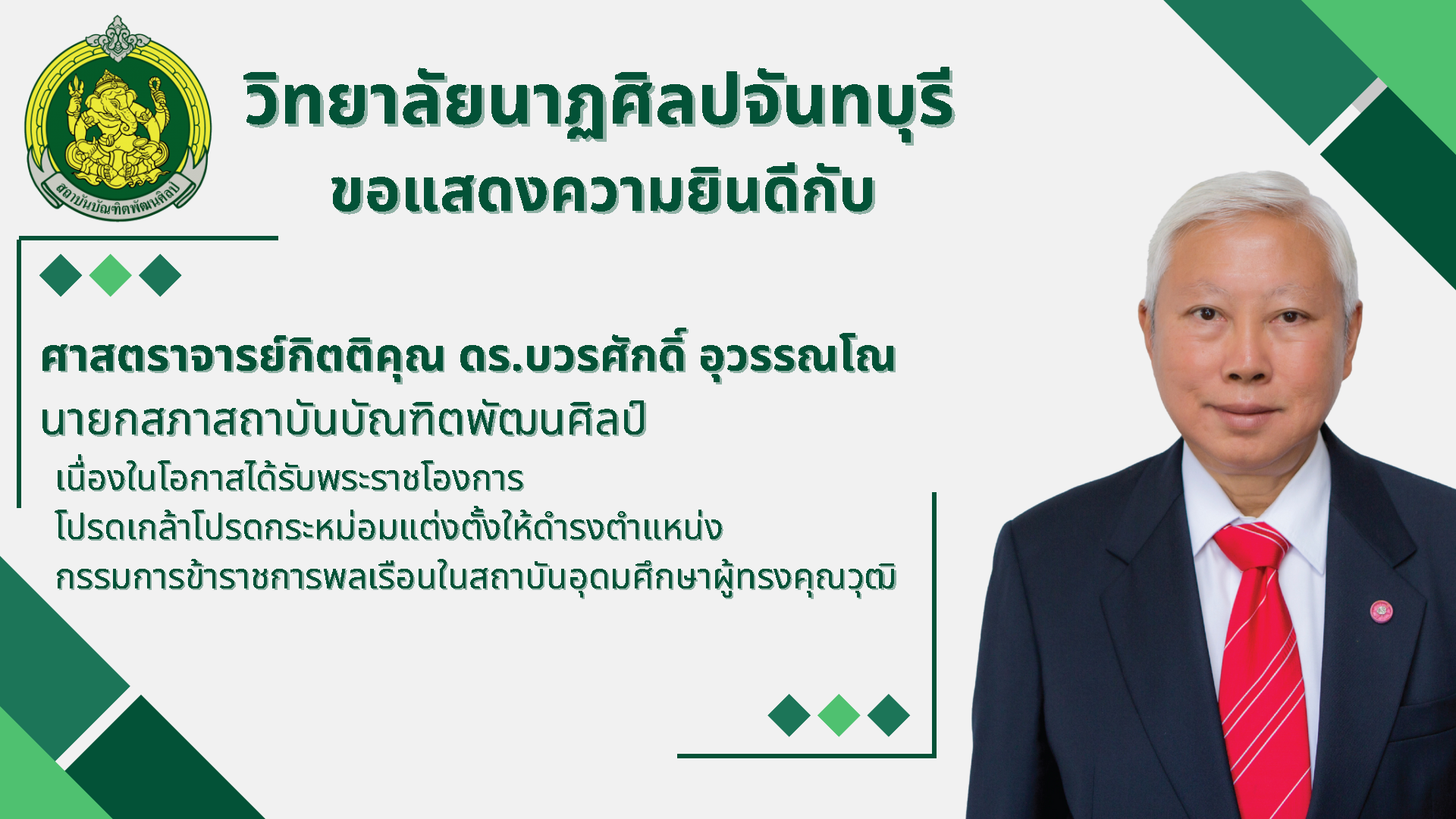 วิทยาลัยนาฎศิลปจันทบุรีขอแสดงความยินดีกับศาสตราจารย์กิตติคุณ ตร.บวรศักดิ์ อุวรรณโณ นายกสภาสถาบันบัณฑิตพัฒนศิลป์ เนื่องในโอกาสได้รับพระราชโองการโปรดเกล้าโปรดกระหม่อมแต่งตั้งให้ดำรงตำแหน่งกรรมการข้าราชก