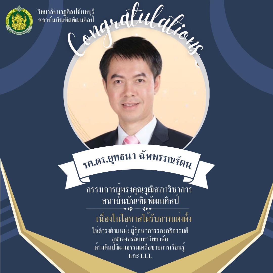 วิทยาลัยนาฏศิลปจันทบุรี สถาบันบัณฑิตพัฒนศิลป์ ขอแสดงความยินดี รศ.ดร.ยุทธนา ฉัพพรรณรัตน์ กรรมการผู้ทรงคุณวุฒิสภาวิชาการ สถาบันบัณฑิตพัฒนศิลป์ เนื่องในโอกาสได้รับการแต่งตั้งให้ดำรง ตำแหน่ง ผู้รักษาการร