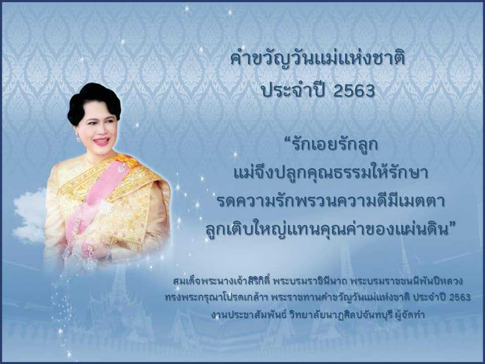 สมเด็จพระนางเจ้าสิริกิติ์ พระบรมราชินีนาถ พระบรมราชชนนีพันปีหลวง ทรงพระกรุณาโปรดเกล้าฯ พระราชทานคำขวัญวันแม่แห่งชาติ ประจำปี 2563