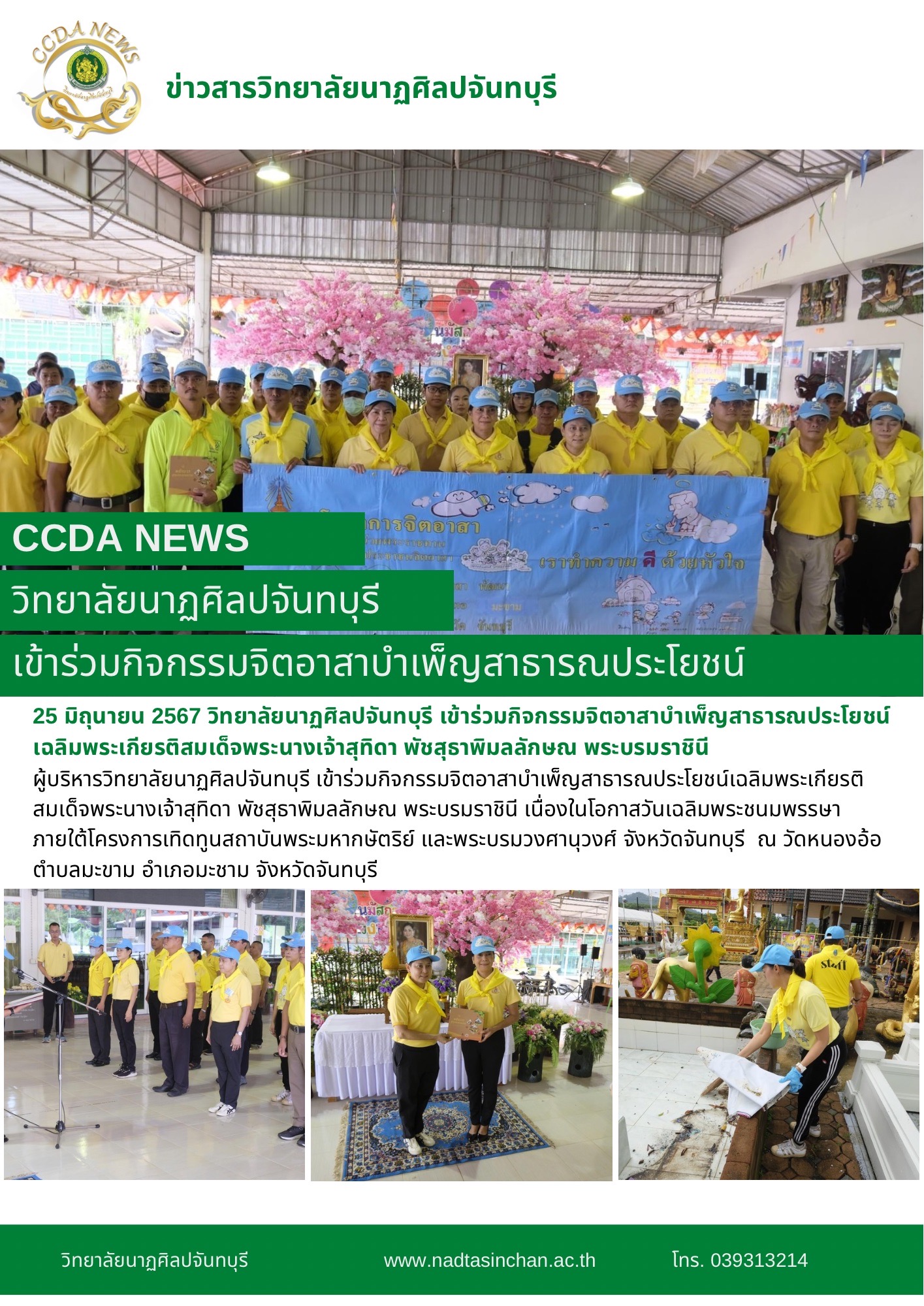 ผู้บริหารวิทยาลัยนาฏศิลปจันทบุรี เข้าร่วมกิจกรรมจิตอาสาบำเพ็ญสาธารณประโยชน์เฉลิมพระเกียรติสมเด็จพระนางเจ้าสุทิดา พัชสุธาพิมลลักษณ พระบรมราชินี เนื่องในโอกาสวันเฉลิมพระชนมพรรษา ๓ มิถุนายน ๒๕๖๗ ภายใต้โค