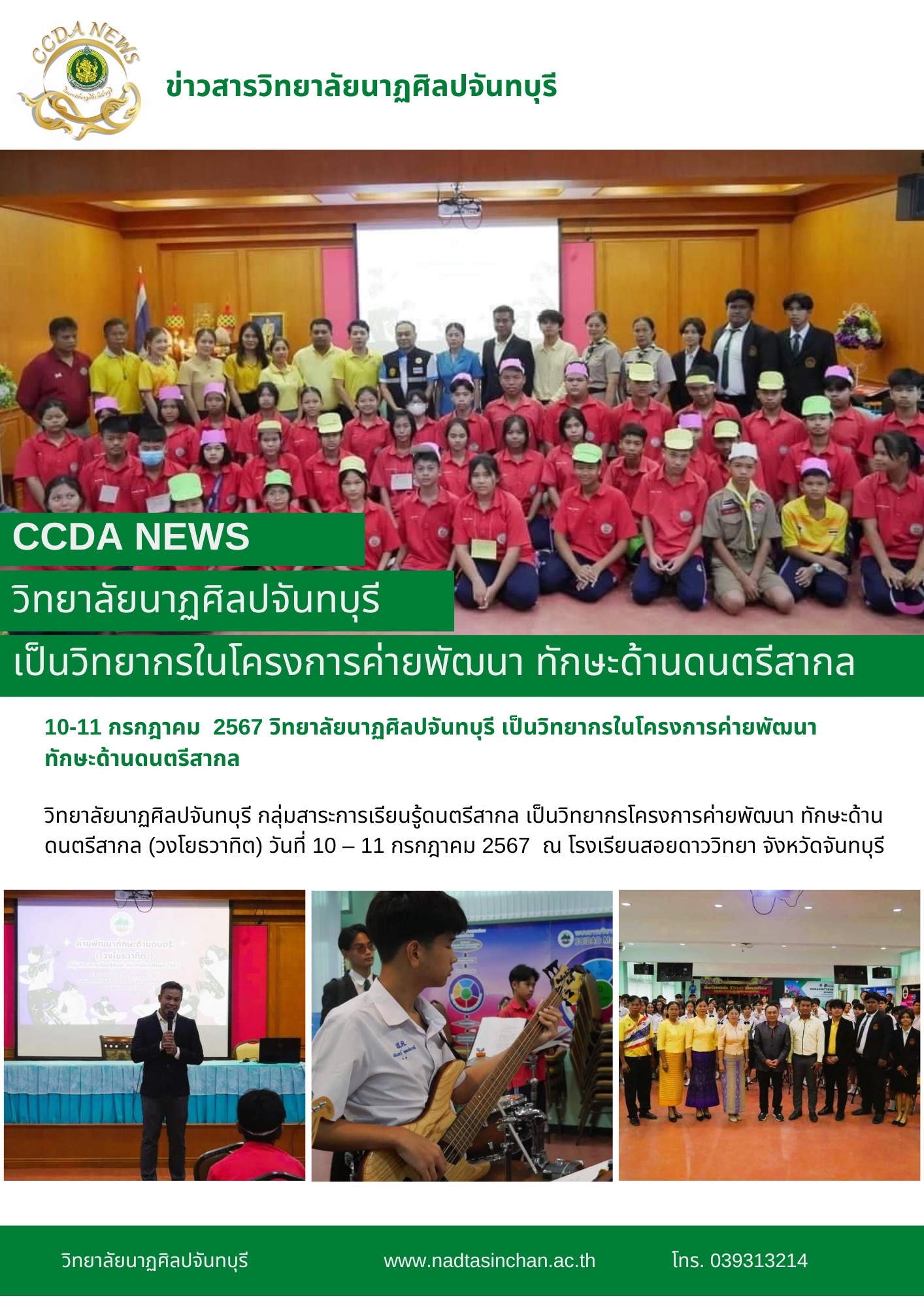 วิทยาลัยนาฏศิลปจันทบุรี กลุ่มสาระการเรียนรู้ดนตรีสากล เป็นวิทยากรโครงการค่ายพัฒนา ทักษะด้านดนตรีสากล (วงโยธวาทิต) วันที่ 10 – 11 กรกฎาคม 2567  ณ โรงเรียนสอยดาววิทยา จังหวัดจันทบุรี