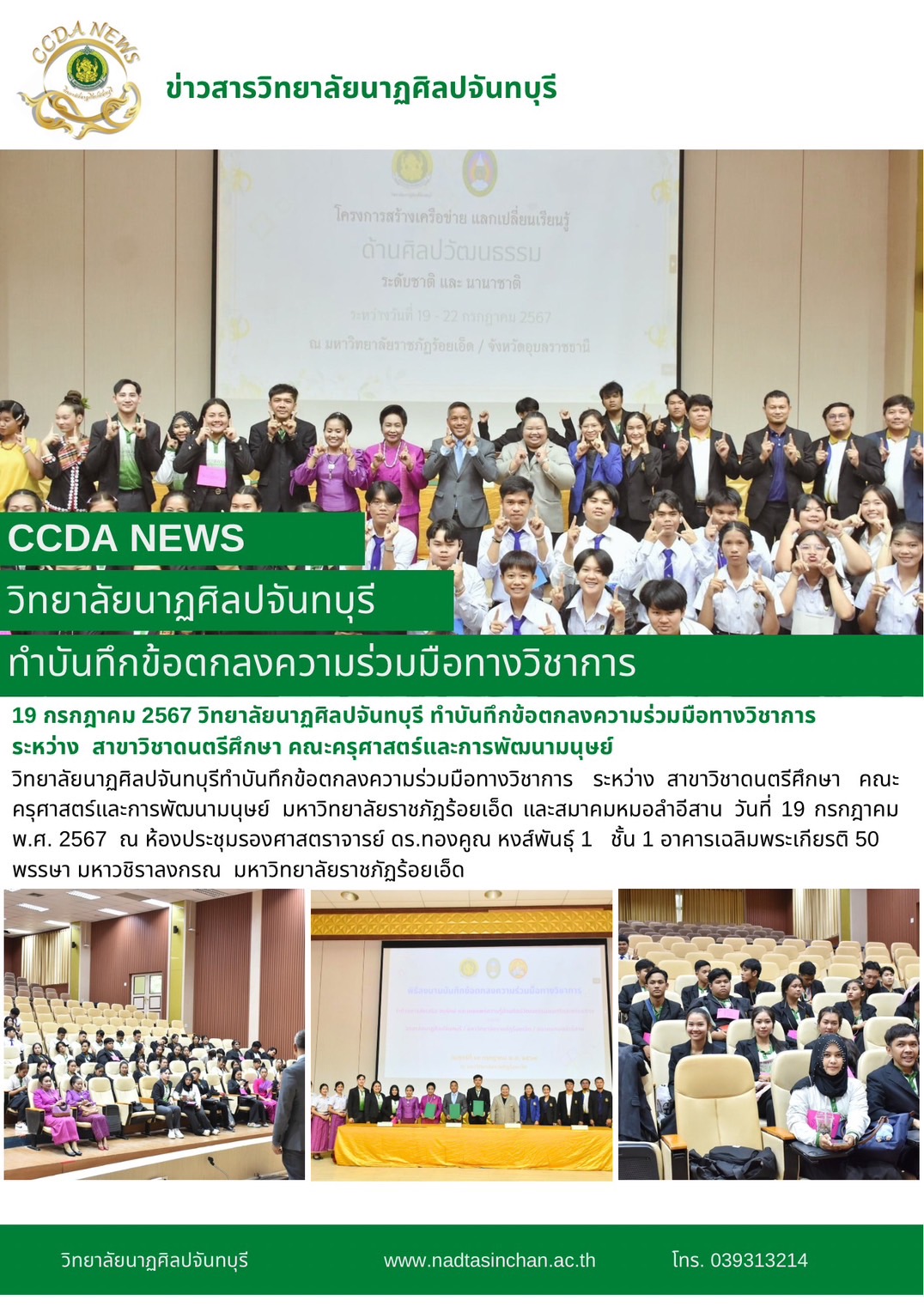 วิทยาลัยนาฏศิลปจันทบุรีทำบันทึกข้อตกลงความร่วมมือทางวิชาการ ระหว่าง สาขาวิชาดนตรีศึกษา คณะครุศาสตร์และการพัฒนามนุษย์ มหาวิทยาลัยราชภัฏร้อยเอ็ด และสมาคมหมอลำอีสาน วันที่ 19 กรกฎาคม พ.ศ. 2567
