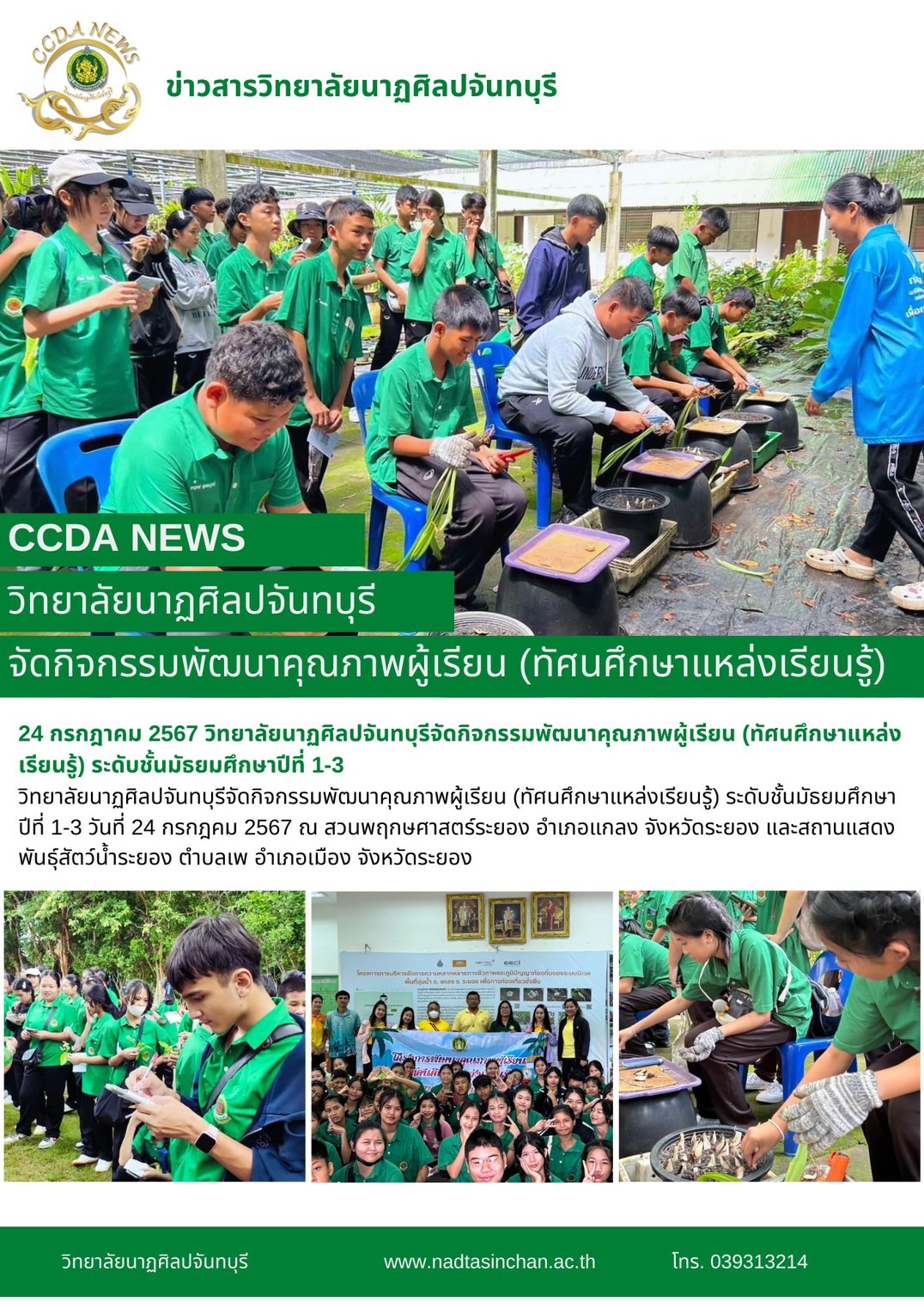 วิทยาลัยนาฏศิลปจันทบุรีจัดกิจกรรมพัฒนาคุณภาพผู้เรียน (ทัศนศึกษาแหล่งเรียนรู้) ระดับชั้นมัธยมศึกษาปีที่ 1-3 วันที่ 24 กรกฎคม 2567 ณ สวนพฤกษศาสตร์ระยอง อำเภอแกลง จังหวัดระยอง และสถานแสดงพันธุ์สัตว์น้ำระ