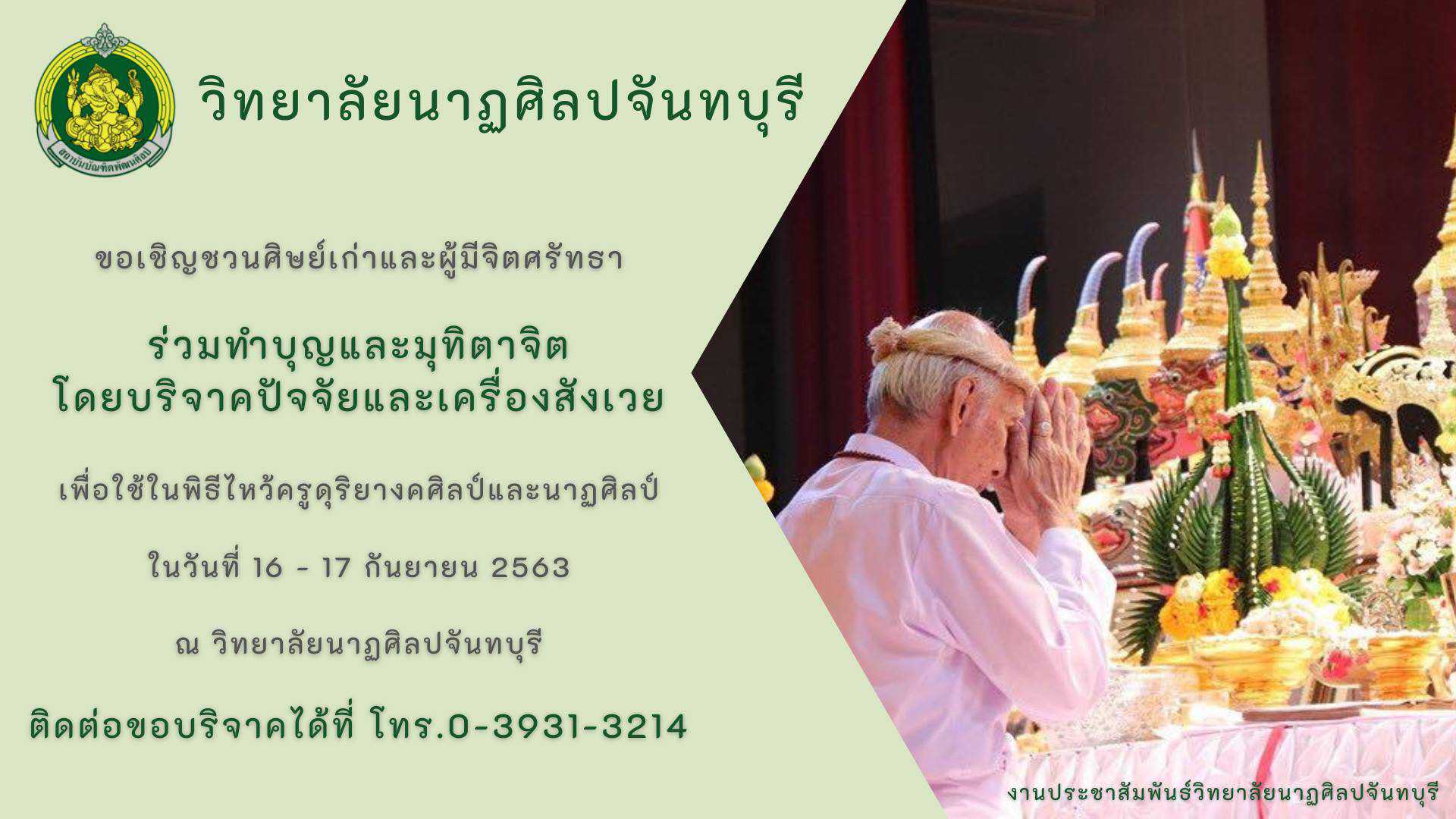 วิทยาลัยนาฏศิลปจันทบุรี ขอเชิญชวนศิษย์เก่าและผู้มีจิตศรัทธา ร่วมทำบุญและมุทิตาจิต โดยบริจาคปัจจัยและเครื่องสังเวย เพื่อใช้ในพิธีไหว้ครูดุริยางคศิลป์และนาฏศิลป์