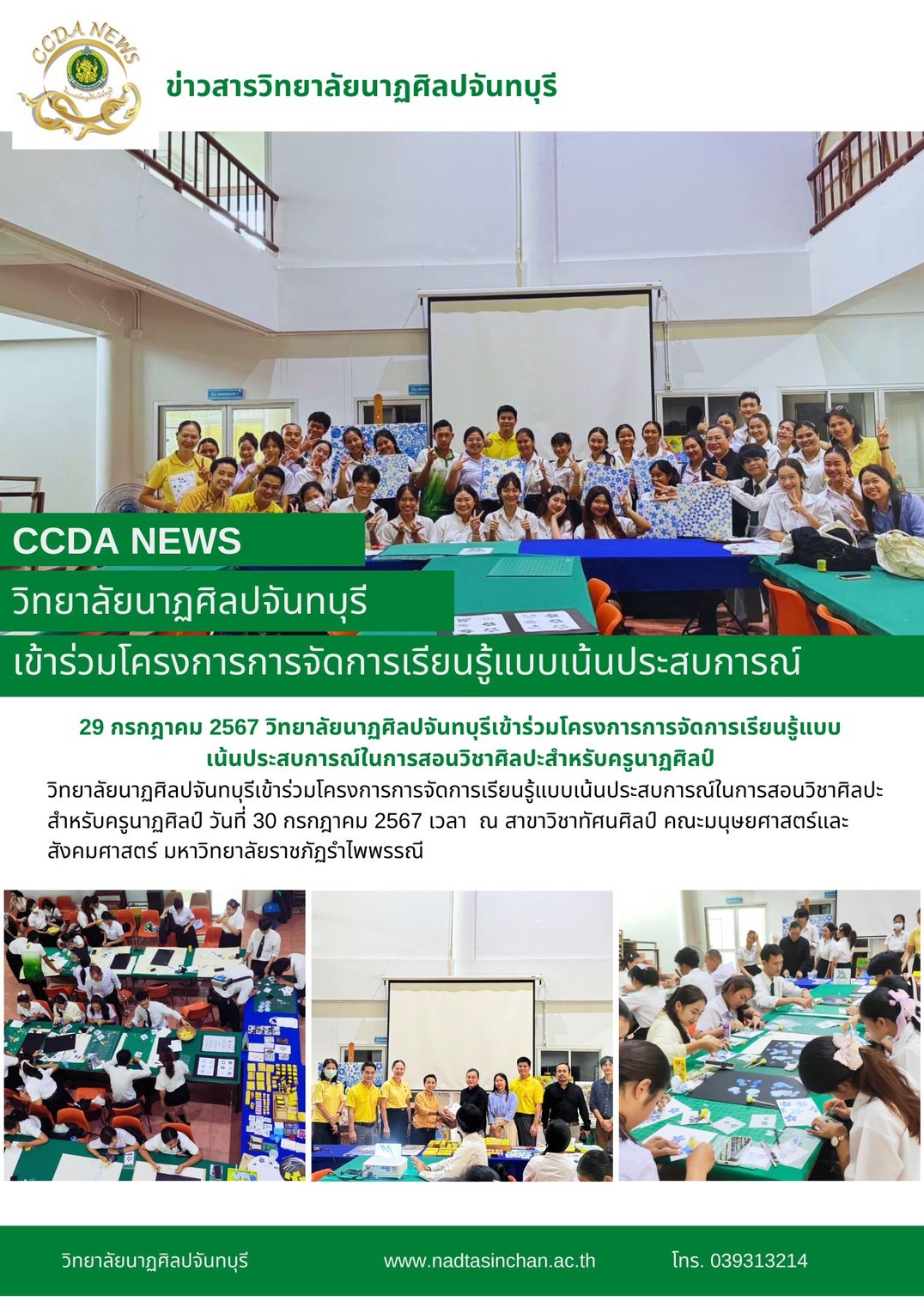 วิทยาลัยนาฏศิลปจันทบุรีเข้าร่วมโครงการการจัดการเรียนรู้แบบเน้นประสบการณ์ในการสอนวิชาศิลปะสำหรับครูนาฏศิลป์ วันที่ 30 กรกฎาคม 2567 เวลา ณ สาขาวิชาทัศนศิลป์ คณะมนุษยศาสตร์และสังคมศาสตร์ มหาวิทยาลัยราชภ