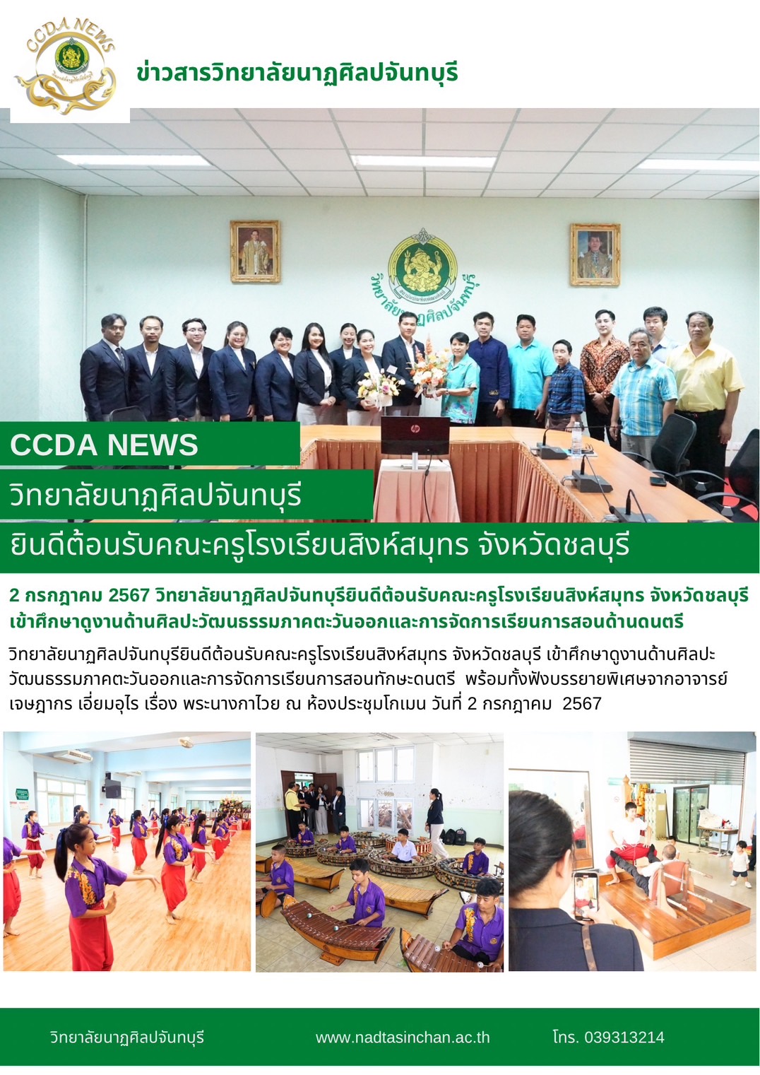 ยินดีต้อนรับคณะครูโรงเรียนสิงห์สมุทร จังหวัดชลบุรี เข้าศึกษาดูงานด้านศิลปะวัฒนธรรมภาคตะวันออกและการจัดการเรียนการสอนทักษะดนตรี พร้อมทั้งฟังบรรยายพิเศษจากอาจารย์เจษฎากร เอี่ยมอุไร เรื่อง พระนางกาไวย ณ ห้องประชุมโกเมน วันที่ 2 กรกฎาคม 2567