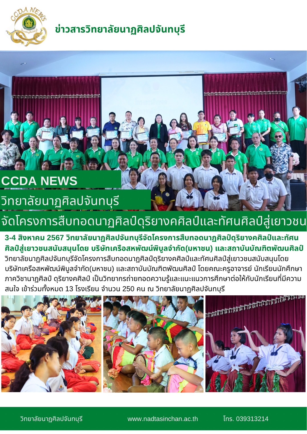 วิทยาลัยนาฏศิลปจันทบุรีจัดโครงการสืบทอดนาฏศิลป์ดุริยางคศิลป์และทัศนศิลป์สู่เยาวชนสนับสนุนโดย บริษัทเครือสหพัฒน์พิบูลจำกัด(มหาชน) และสถาบันบัณฑิตพัฒนศิลป์ โดยคณะครูอาจารย์ นักเรียนนักศึกษาภาควิชานาฏศิลป์ ดุริยางคศิลป์ เป็นวิทยากรถ่ายทอดความรู้และแนะแนวการศึกษาต่อให้กับนักเรียนที่มีความสนใจ เข้าร่วมทั้งหมด 13 โรงเรียน จำนวน 250 คน ณ วิทยาลัยนาฏศิลปจันทบุรี วันที่3-4 สิงหาคม 2567
