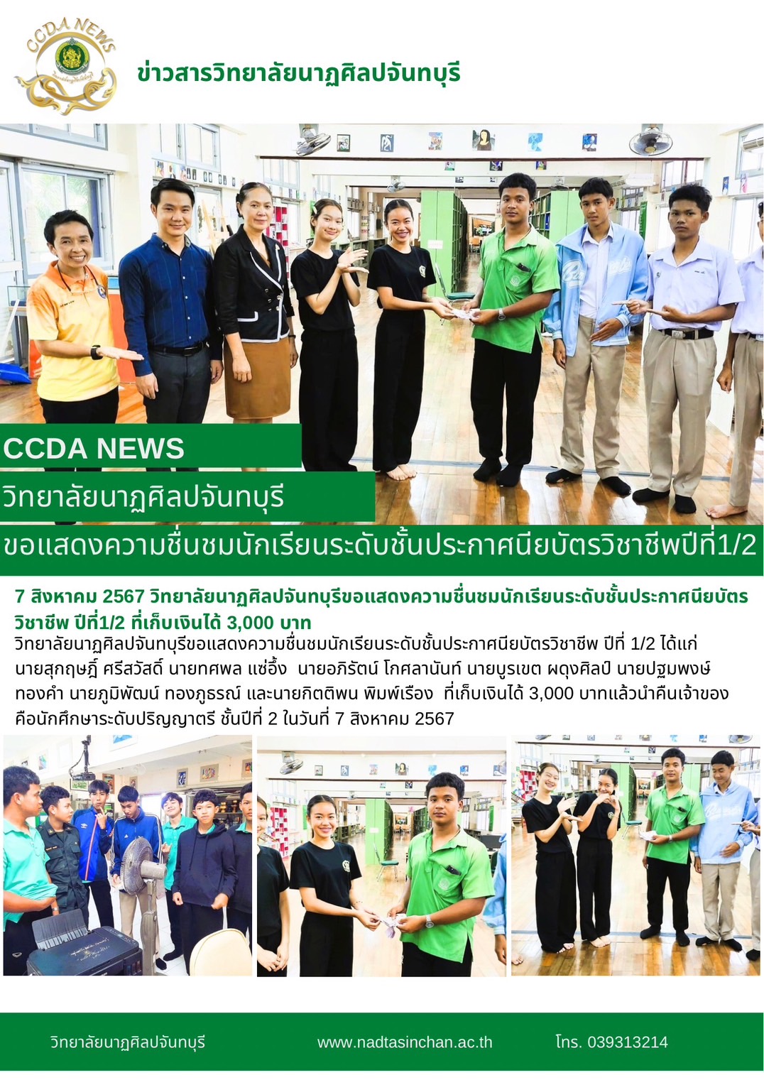 วิทยาลัยนาฏศิลปจันทบุรีขอแสดงความชื่นชมนักเรียนระดับชั้นประกาศนียบัตรวิชาชีพ ปีที่ 1/2 ได้แก่ นายสุกฤษฎิ์ ศรีสวัสดิ์ นายทศพล แซ่อึ้ง  นายอภิรัตน์ โกศลานันท์ นายบูรเขต ผดุงศิลป์ นายปฐมพงษ์ ทองคำ นายภูมิพัฒน์ ทองภูธรณ์ และนายกิตติพน พิมพ์เรือง  ที่เก็บเงินได้ 3,000 บาทแล้วนำคืนเจ้าของ คือนักศึกษาระดับปริญญาตรี ชั้นปีที่ 2 ในวันที่ 7 สิงหาคม 2567