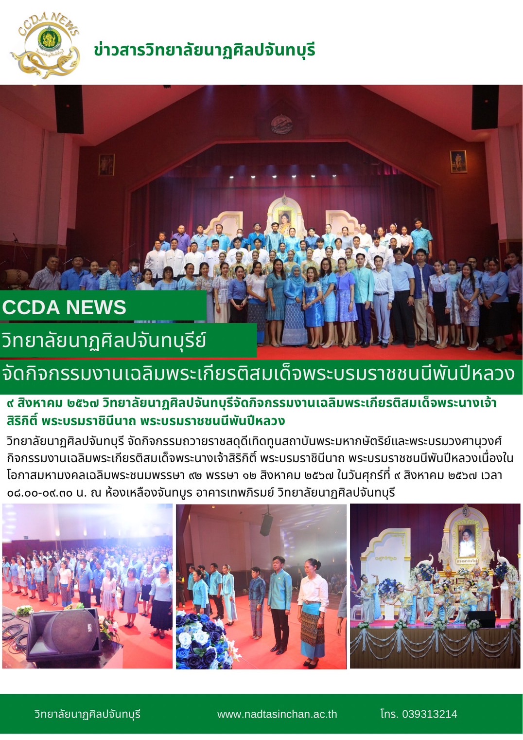 กิจกรรมงานเฉลิมพระเกียรติสมเด็จพระนางเจ้าสิริกิติ์ พระบรมราชินีนาถ พระบรมราชชนนีพันปีหลวงเนื่องในโอกาสมหามงคลเฉลิมพระชนมพรรษา ๙๒ พรรษา ๑๒ สิงหาคม ๒๕๖๗ ในวันศุกร์ที่ ๙ สิงหาคม ๒๕๖๗ เวลา ๐๘.๐๐-๐๙.๓๐ น. ณ ห้องเหลืองจันทบูร อาคารเทพภิรมย์ วิทยาลัยนาฏศิลปจันทบุรี