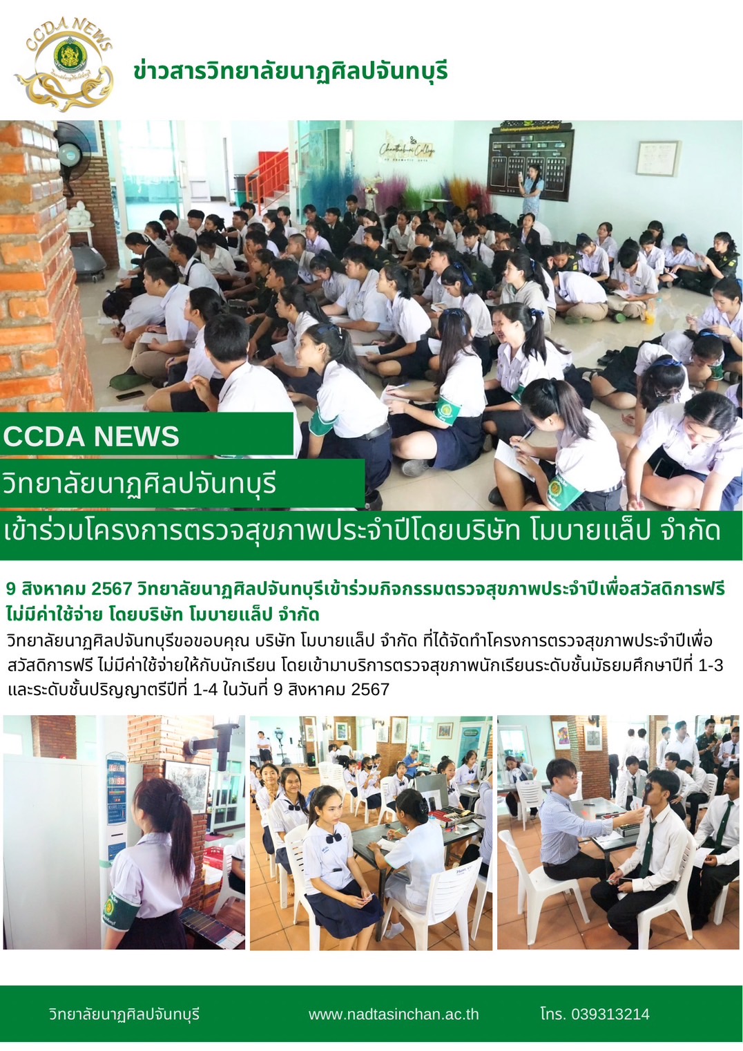 วิทยาลัยนาฏศิลปจันทบุรีขอขอบคุณ บริษัท โมบายแล็ป จำกัด ที่ได้จัดทำโครงการตรวจสุขภาพประจำปีเพื่อสวัสดิการฟรี ไม่มีค่าใช้จ่ายให้กับนักเรียน โดยเข้ามาบริการตรวจสุขภาพนักเรียนระดับชั้นมัธยมศึกษาปีที่ 1-3 และระดับชั้นปริญญาตรีปีที่ 1-4 ในวันที่ 9 สิงหาคม 2567