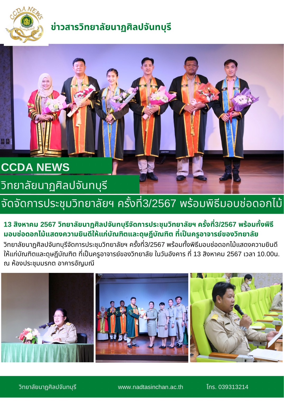 วิทยาลัยนาฏศิลปจันทบุรีจัดการประชุมวิทยาลัยฯ ครั้งที่3/2567 พร้อมทั้งพิธีมอบช่อดอกไม้แสดงความยินดีให้แก่บัณฑิตและดุษฎีบัณฑิต ที่เป็นครูอาจารย์ของวิทยาลัย ในวันอังคาร ที่ 13 สิงหาคม 2567 เวลา 10.00น. ณ ห้องประชุมมรกต อาคารอัญมณี