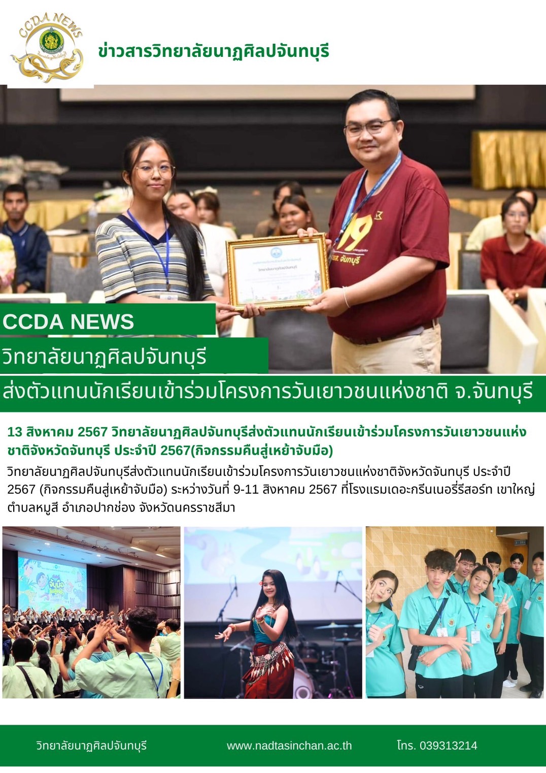 วิทยาลัยนาฏศิลปจันทบุรีส่งตัวแทนนักเรียนเข้าร่วมโครงการวันเยาวชนแห่งชาติจังหวัดจันทบุรี ประจำปี 2567 (กิจกรรมคืนสู่เหย้าจับมือ) ระหว่างวันที่ 9-11 สิงหาคม 2567 ที่โรงแรมเดอะกรีนเนอรี่รีสอร์ท เขาใหญ่ ต