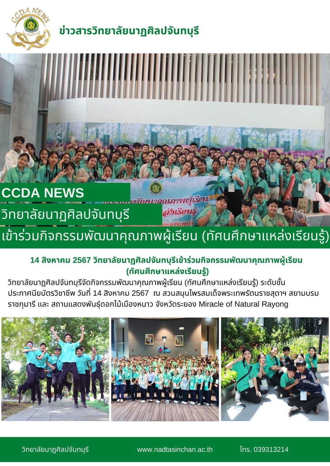 วิทยาลัยนาฏศิลปจันทบุรีจัดกิจกรรมพัฒนาคุณภาพผู้เรียน (ทัศนศึกษาแหล่งเรียนรู้) ระดับชั้นประกาศนียบัตรวิชาชีพ วันที่ 14 สิงหาคม 2567  ณ สวนสมุนไพรสมเด็จพระเทพรัตนราชสุดาฯ สยามบรมราชกุมารี และ สถานแสดงพันธุ์ดอกไม้เมืองหนาว จังหวัดระยอง Miracle of Natural Rayong