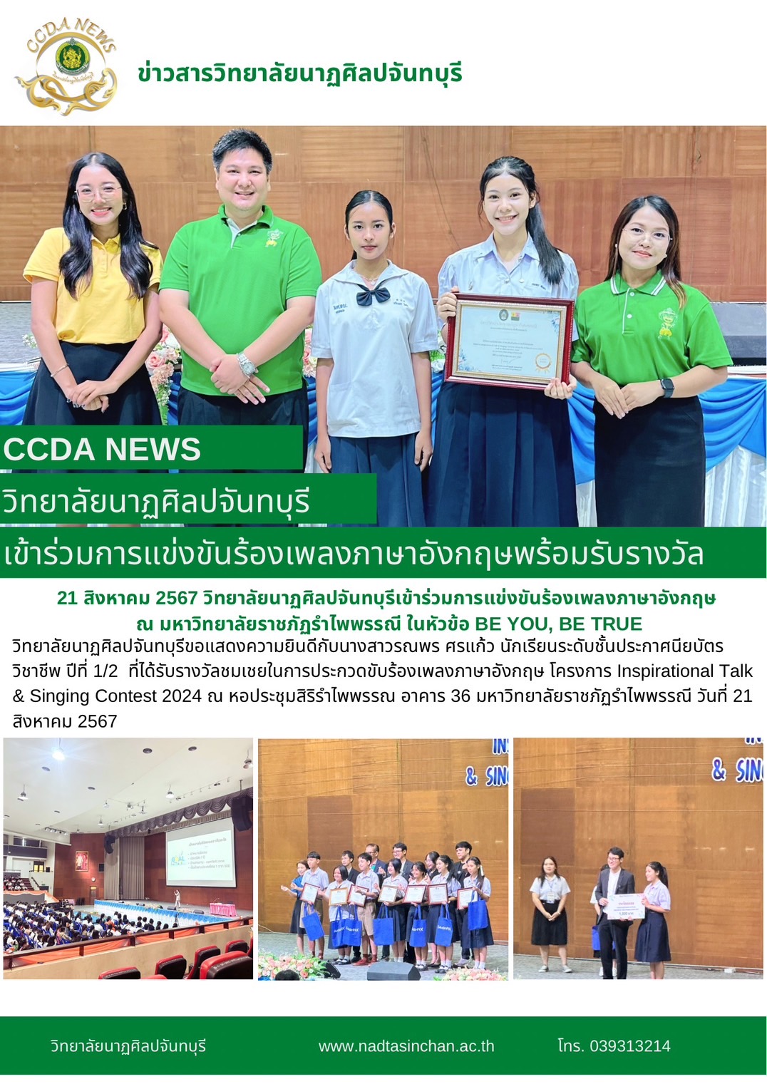 วิทยาลัยนาฏศิลปจันทบุรีเข้าร่วมการแข่งขันประกวดร้องเพลงภาษาอังกฤษในหัวข้อ Be you, be true พร้อมรับรางวัล โดยขอแสดงความยินดีกับนางสาวรณพร ศรแก้ว นักเรียนระดับชั้นประกาศนียบัตรวิชาชีพ ปีที่ 1/2 ที่ได้รับรางวัลชมเชยในการประกวดขับร้องเพลงภาษาอังกฤษ โครงการ Inspirational Talk & Singing Contest 2024 ณ หอประชุมสิริรำไพพรรณ อาคาร 36 มหาวิทยาลัยราชภัฏรำไพพรรณี วันที่ 21 สิงหาคม 2567