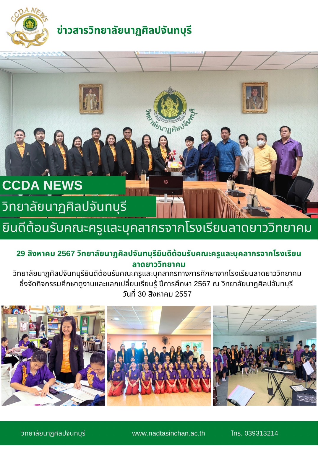 วิทยาลัยนาฏศิลปจันทบุรียินดีต้อนรับคณะครูและบุคลากรทางการศึกษาจากโรงเรียนลาดยาววิทยาคม ซึ่งจัดกิจกรรมศึกษาดูงานและแลกเปลี่ยนเรียนรู้ ปีการศึกษา 2567 ณ วิทยาลัยนาฏศิลปจันทบุรี วันที่ 30 สิงหาคม 2557