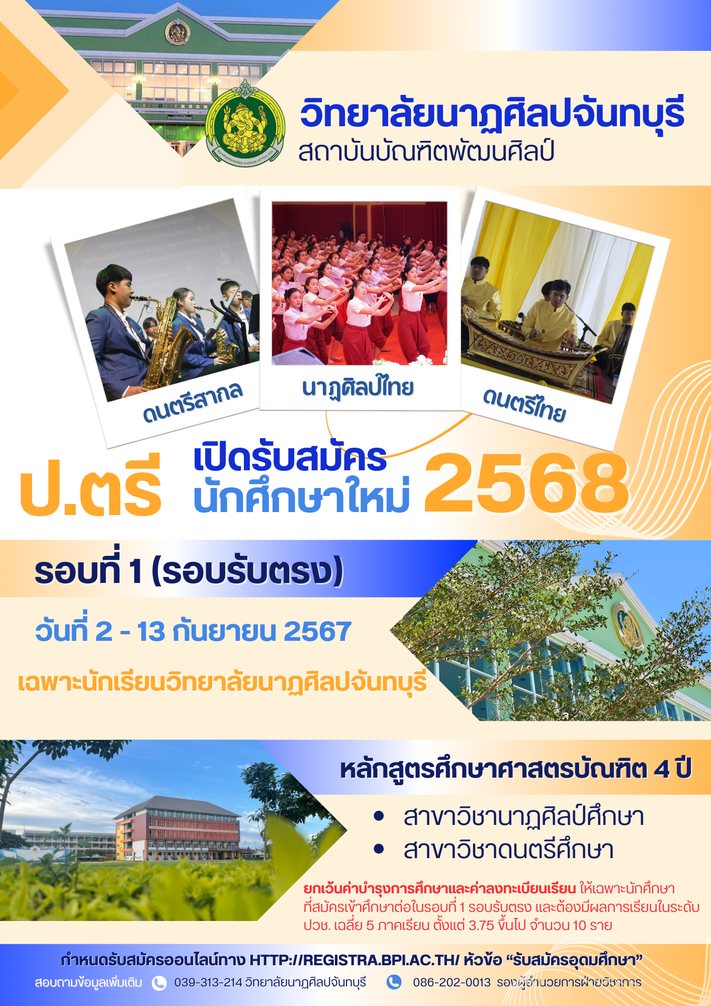 เปิดรับสมัคร นักศึกษาใหม่ ป.ตรี 2568 รอบที่ 1 (รอบรับตรง) วันที่ 2 - 13 กันยายน 2567 เฉพาะนักเรียนวิทยาลัยนาฏศิลปจันทบุรี หลักสูตรศึกษาศาสตรบัณฑิต 4 ปี สาขาวิชานาฏศิลป์ศึกษา สาขาวิชาดนตรีศึกษา