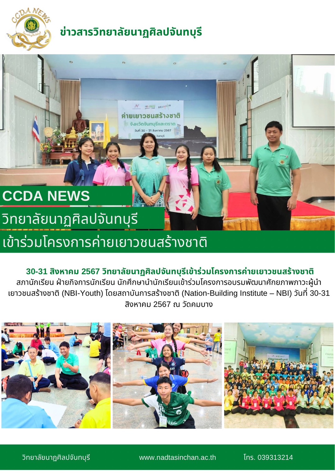 สภานักเรียน ฝ่ายกิจการนักเรียน นักศึกษาวิทยาลัยนาฏศิลป์จันทบุรีนำนักเรียนเข้าร่วมโครงการอบรมพัฒนาศักยภาพภาวะผู้นำเยาวชนสร้างชาติ (NBI-Youth) โดยสถาบันการสร้างชาติ (Nation-Building Institute – NBI) วันที่ 30-31 สิงหาคม 2567 ณ วัดคมบาง