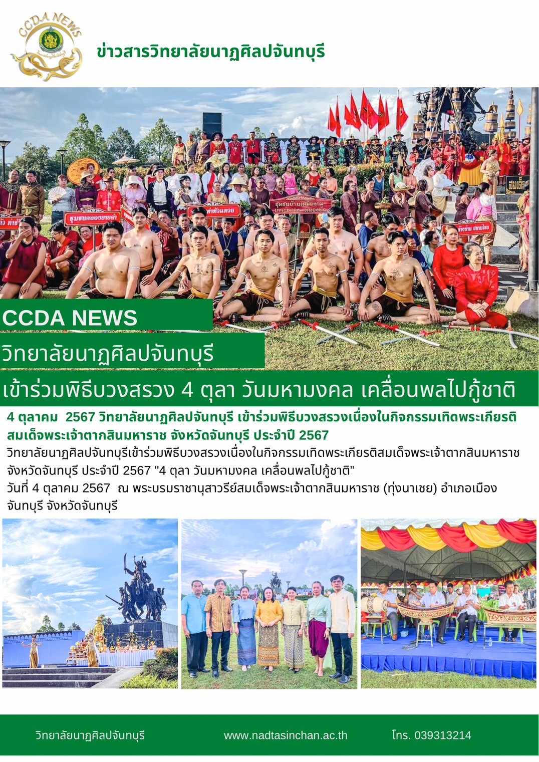 วิทยาลัยนาฏศิลปจันทบุรีเข้าร่วมพิธีบวงสรวงเนื่องในกิจกรรมเทิดพระเกียรติสมเด็จพระเจ้าตากสินมหาราช จังหวัดจันทบุรี ประจำปี 2567 "4 ตุลา วันมหามงคล เคลื่อนพลไปกู้ชาติ” วันที่ 4 ตุลาคม 2567 ณ พระบรมราชานุสาวรีย์สมเด็จพระเจ้าตากสินมหาราช (ทุ่งนาเชย) อำเภอเมืองจันทบุรี จังหวัดจันทบุรี