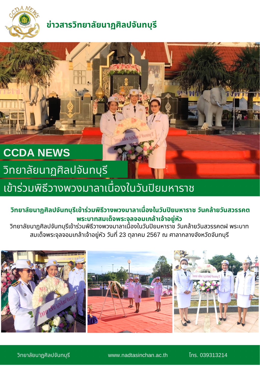 วิทยาลัยนาฏศิลปจันทบุรีเข้าร่วมพิธีวางพวงมาลาเนื่องในวันปิยมหาราช วันคล้ายวันสวรรคตฝ พระบาทสมเด็จพระจุลจอมเกล้าเจ้าอยู่หัว วันที่ 23 ตุลาคม 2567 ณ ศาลากลางจังหวัดจันทบุรี