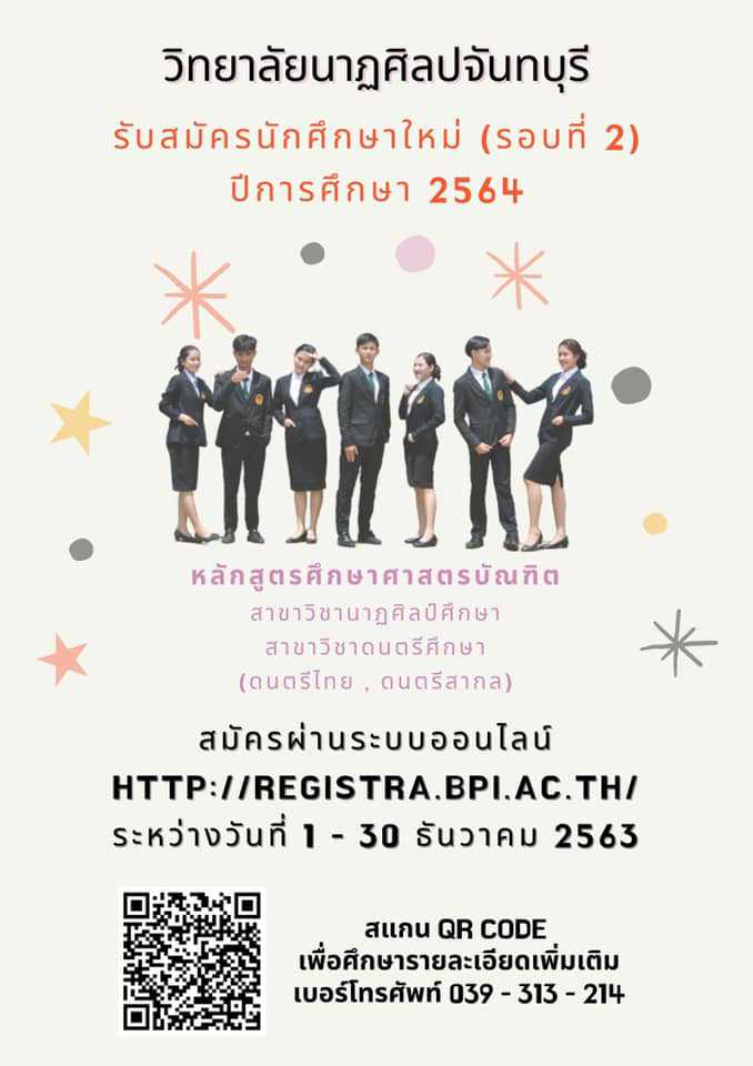 วิทยาลัยนาฏศิลปจันทบุรี #รับสมัครนักศึกษาใหม่ รอบที่ 2 ปีการศึกษา 2564 หลักสูตรศึกษาศาสตรบัณฑิต สาขาวิชานาฏศิลป์ศึกษา และสาขาวิชาดนตรีศึกษา (ดนตรีไทย , ดนตรีสากล) ผู้สนใจสามารถสมัครผ่านระบบออนไลน์ http://registra.bpi.ac.th/ หัวข้อ “รับสมัครอุดมศึกษา” พร้อมพิมพ์ใบชำระเงินค่าสมัครจำนวน 500 บาท และชำระค่าสมัครที่ธนาคารกรุงไทยทุกสาขาได้ตั้งแต่วันที่ 1 - 30 ธันวาคม 2563 (ต้องชำระเงินภายในวันเวลาที่กำหนดเท่านั้น)