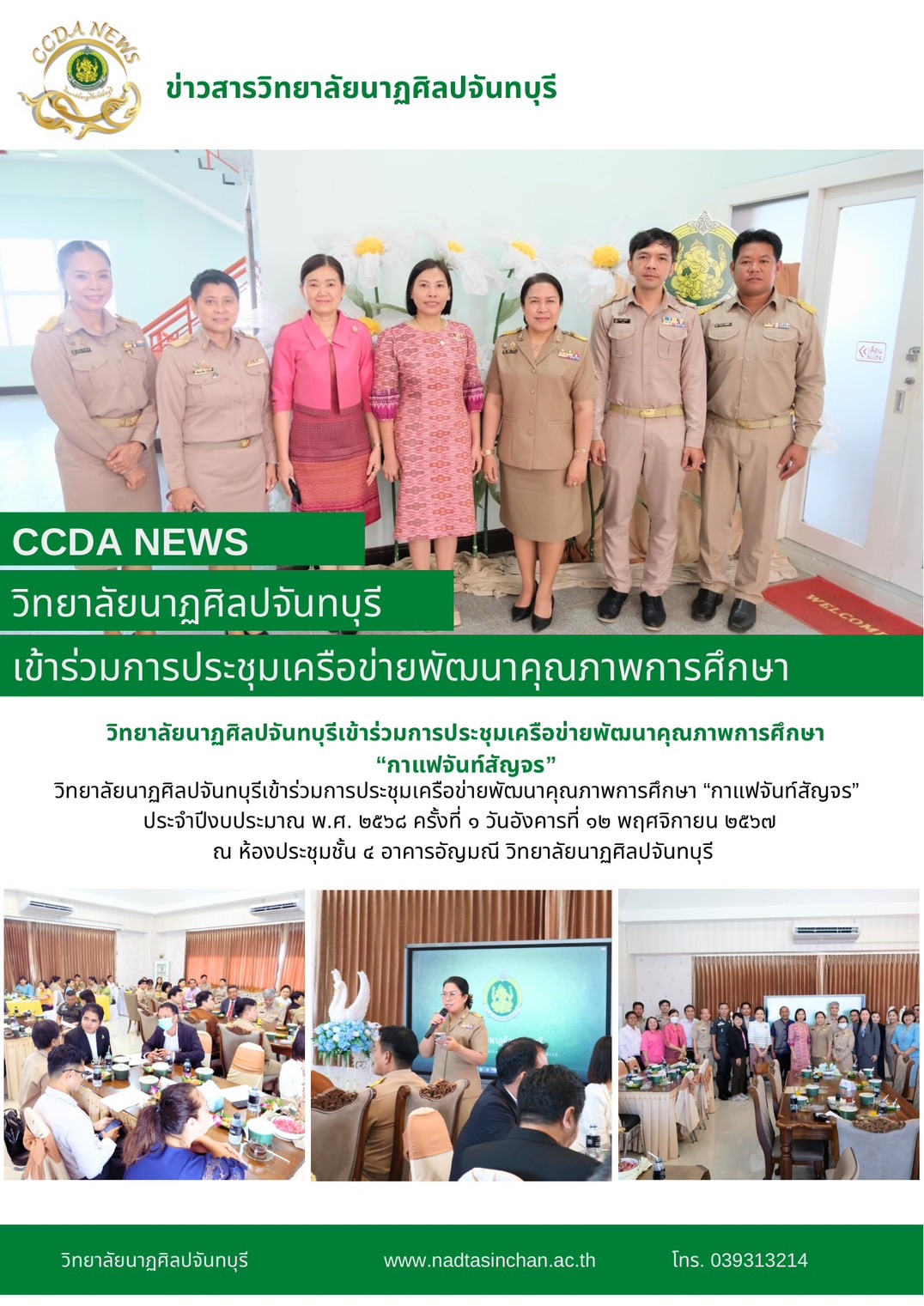 วิทยาลัยนาฏศิลปจันทบุรีเข้าร่วมการประชุมเครือข่ายพัฒนาคุณภาพการศึกษา ?กาแฟจันท์สัญจร? ประจำปีงบประมาณ พ.ศ. ๒๕๖๘ ครั้งที่ ๑ วันอังคารที่ ๑๒ พฤศจิกายน ๒๕๖๗ ณ ห้องประชุมชั้น ๔ อาคารอัญมณี วิทยาลัยนาฏศิล