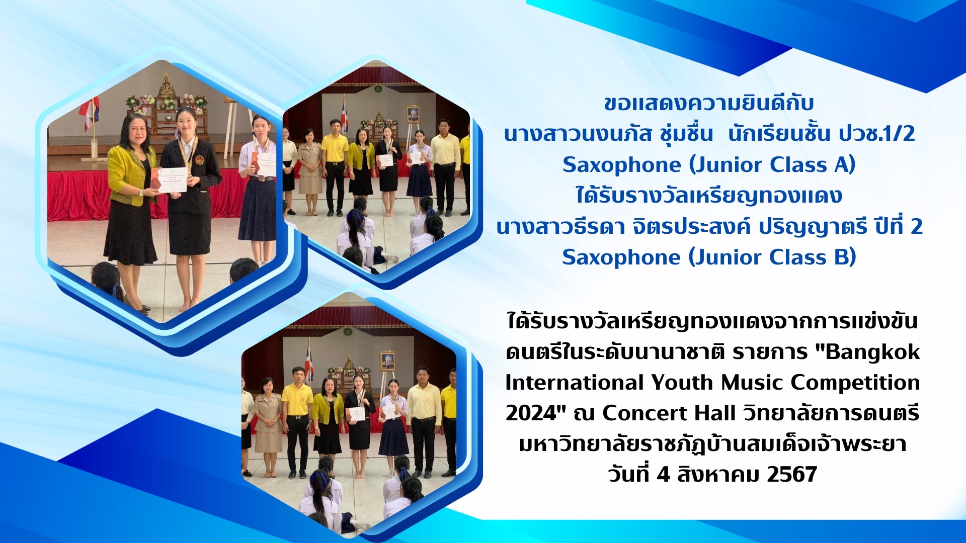 ขอแสดงความยินดีกับ นางสาวนงนภัส ชุ่มชื่น นักเรียนชั้น ปวช.1/2 Saxophone (Junior Class A) ได้รับรางวัลเหรียญทองแดง นางสาวธีรดา จิตรประสงค์ ปริญญาตรี ปีที่ 2 Saxophone (Junior Class B) ได้รับรางวัลเหรียญทองแดง    จากการแข่งขันดนตรีในระดับนานาชาติ รายการ "Bangkok International Youth Music Competition 2024"  ณ Concert Hall วิทยาลัยการดนตรีมหาวิทยาลัยราชภัฏบ้านสมเด็จเจ้าพระยา วันที่ 4 สิงหาคม 2567