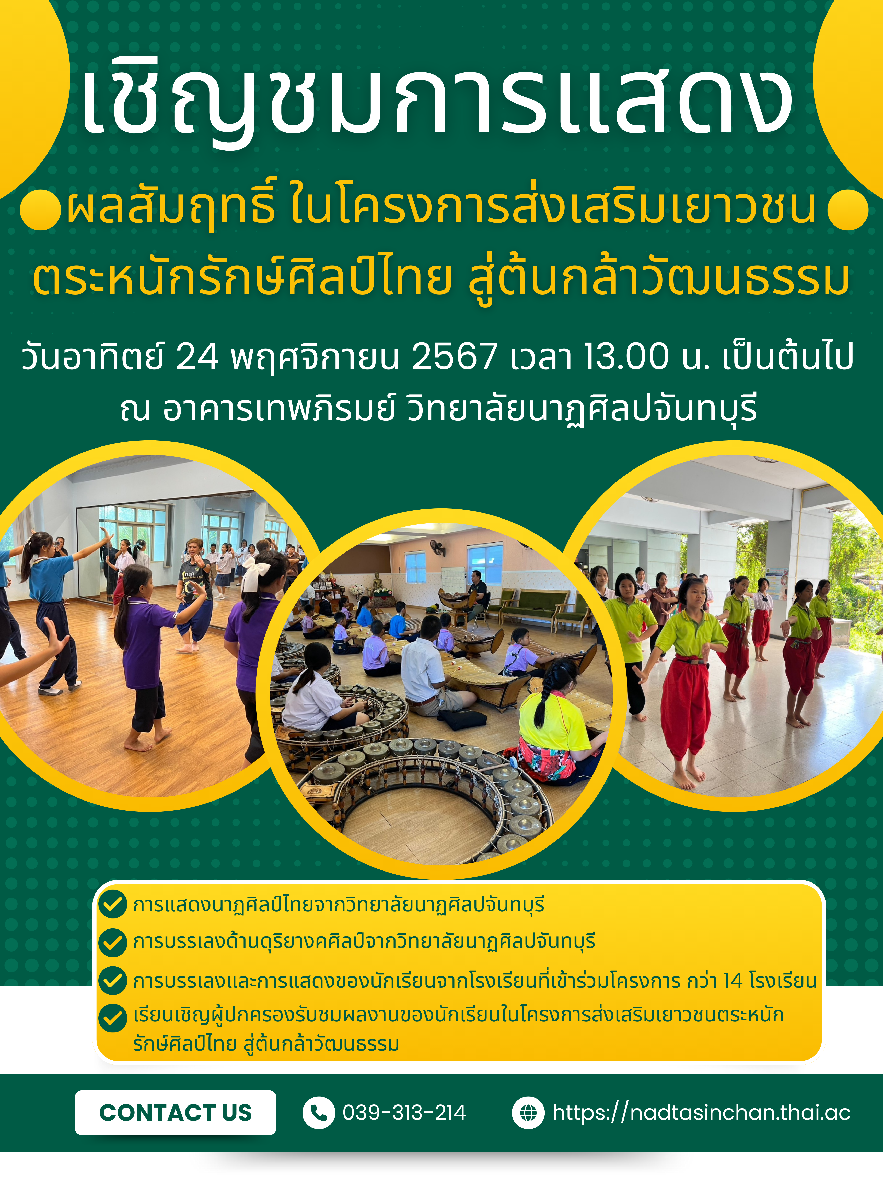 เชิญชมการแสดงผลสัมฤทธิ์ในโครงการส่งเสริมเยาวชนตระหนักรักษ์ศิลป์ไทย สู่ต้นกล้าวัฒนธรรม วันอาทิตย์ที่ 24 พฤศจิกายน 2567 เวลา 13.00 น. เป็นต้นไป ณ อาคารเทพภิรมย์ วิทยาลัยนาฏศิลปจันทบุรี