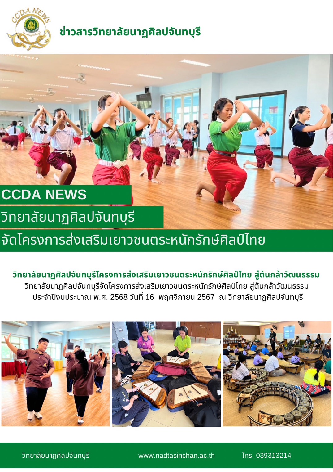 วิทยาลัยนาฏศิลปจันทบุรีจัดโครงการส่งเสริมเยาวชนตระหนักรักษ์ศิลป์ไทย สู่ต้นกล้าวัฒนธรรม ประจำปีงบประมาณ พ.ศ. 2568 วันที่ 16 พฤศจิกายน 2567 ณ วิทยาลัยนาฏศิลปจันทบุรี